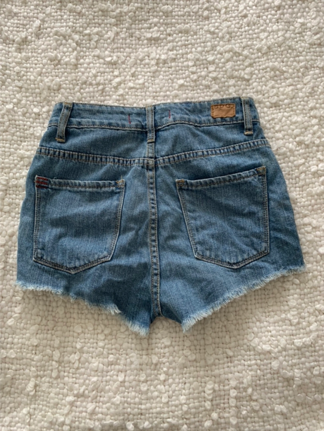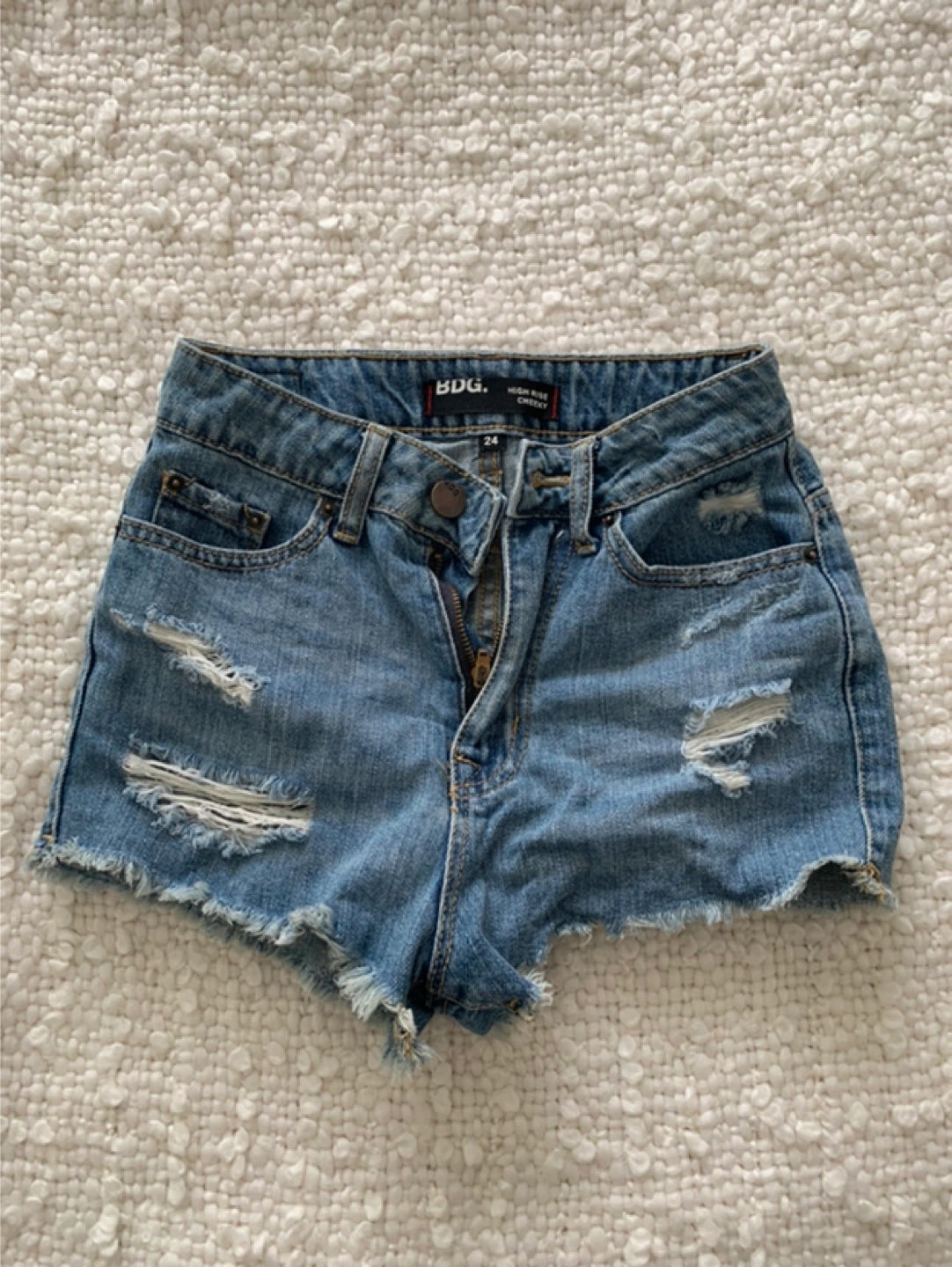 Denim shorts featuring distressed detailing. High-waisted fit, with a raw hem.