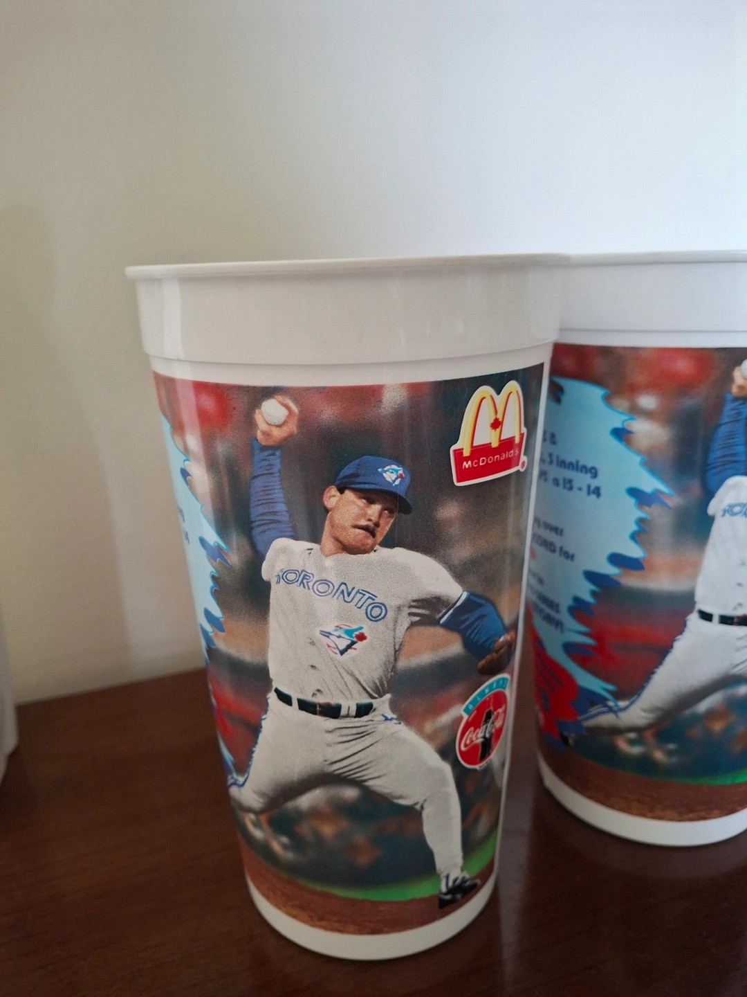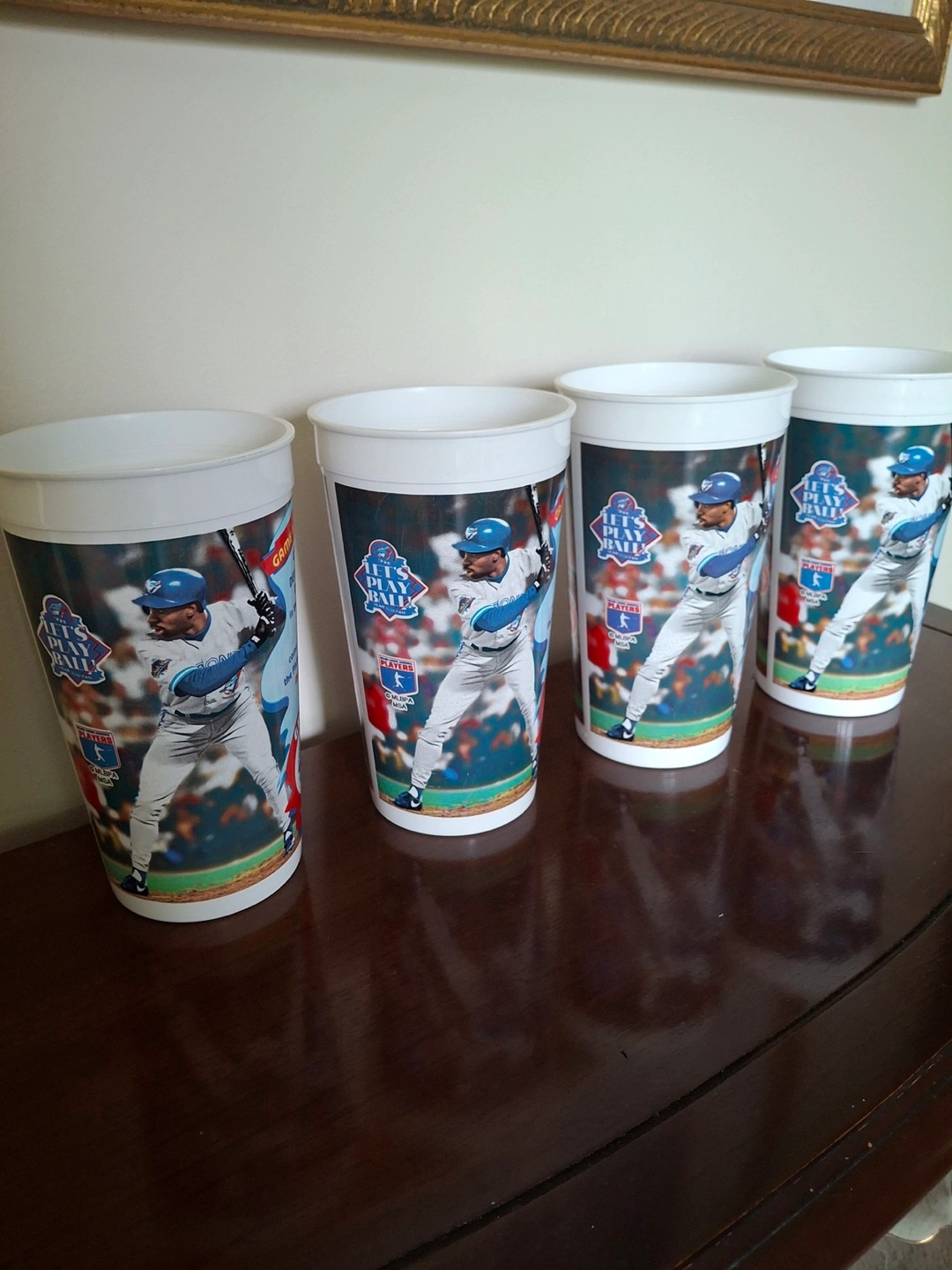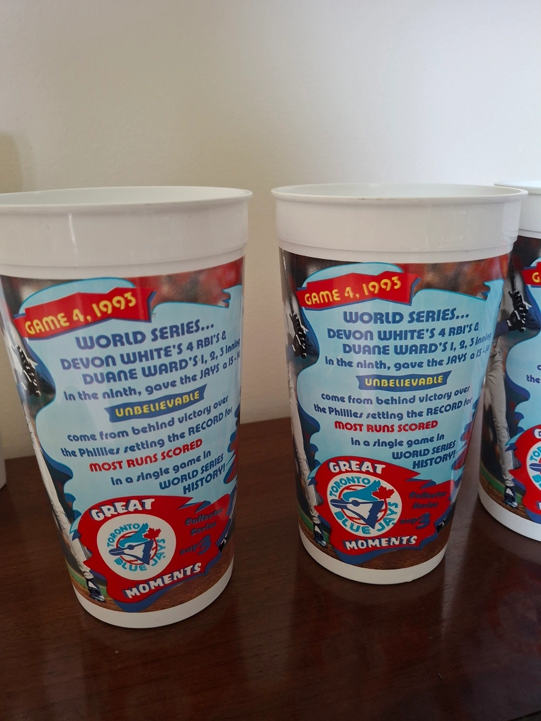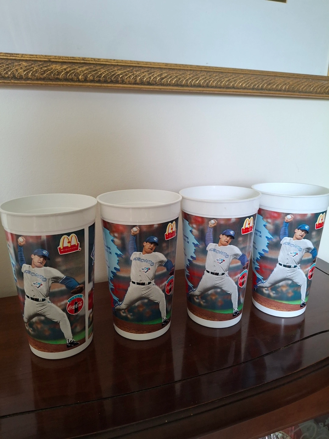 1000+Four collectible cups (all the same) from McDonald’s, Blue Jays 1993 World Series. Cup 3 in collector series, game 4. Features Devon White & Duane Ward. $4 each Available for pickup in Markland Wood.