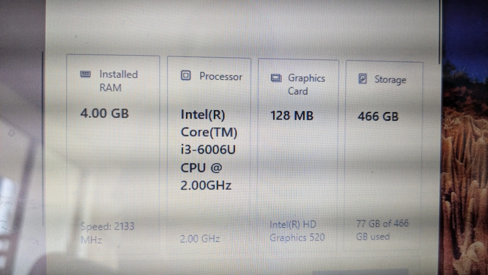 25HP laptop with 4GB RAM, Intel core i3- 6006 U at 2 GHz, Intel HD Graphics 520 and 500 GB storage. good for kids school work/ llight work