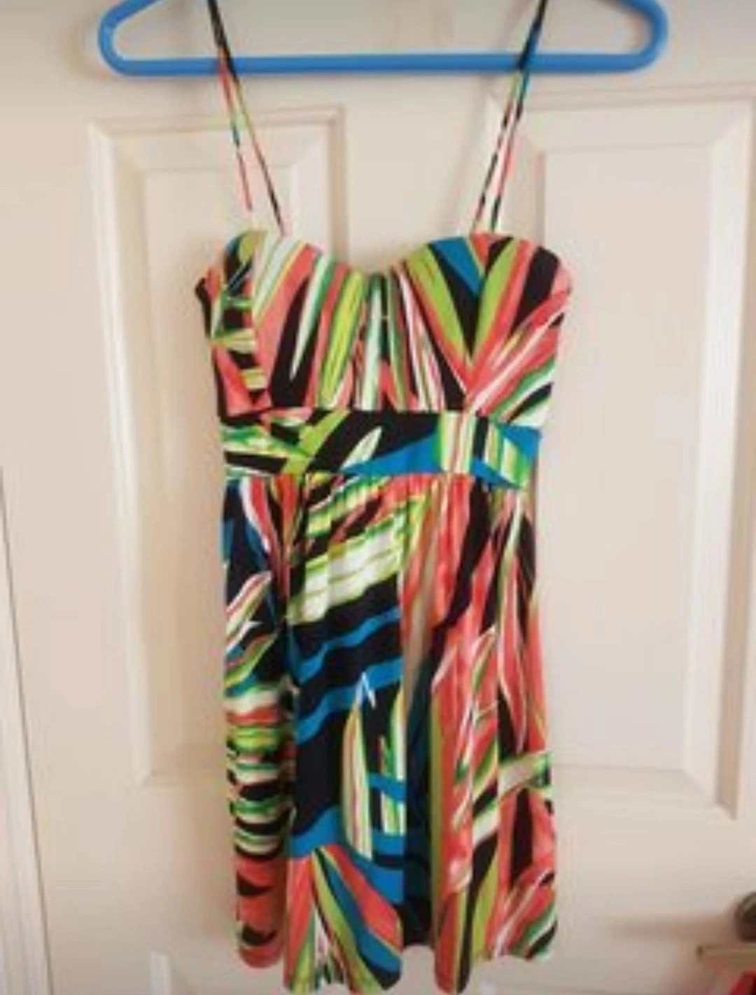 Strapless dress. Features a vibrant colourful pattern. Lightweight and airy fabric. Perfect for warm weather relaxation, this dress will keep you feeling cool and comfortable all day long.