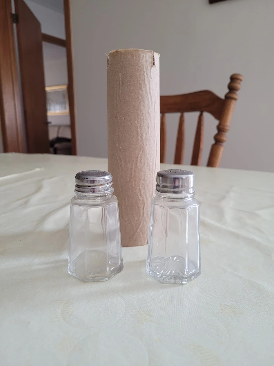 New, never been used large salt & pepper shakers. (Paper towel roll used to show size)