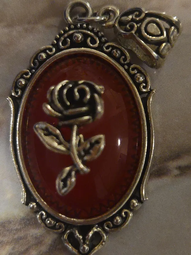 Oval pendant with a rose design. Features a red background with a silver-tone metal. The pendant is perfect for a day out or a night on the town, adding a touch of beauty to your look.