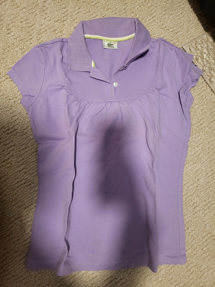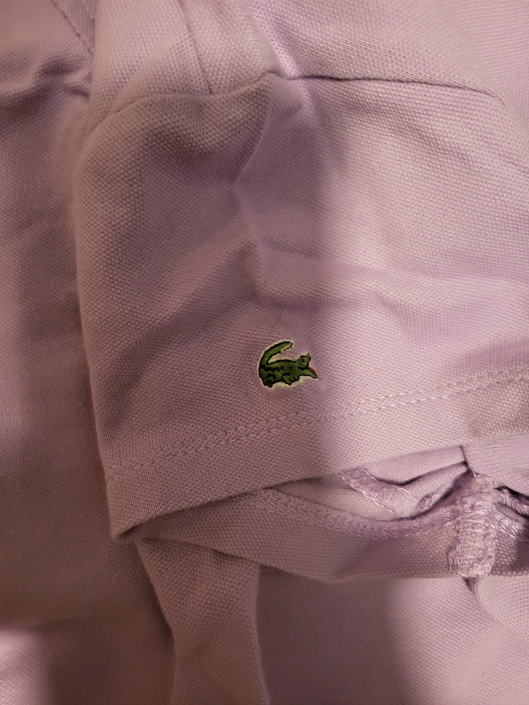 A lavender polo shirt. Short sleeves. Features a button-up collar. The shirt has the Lacoste logo.