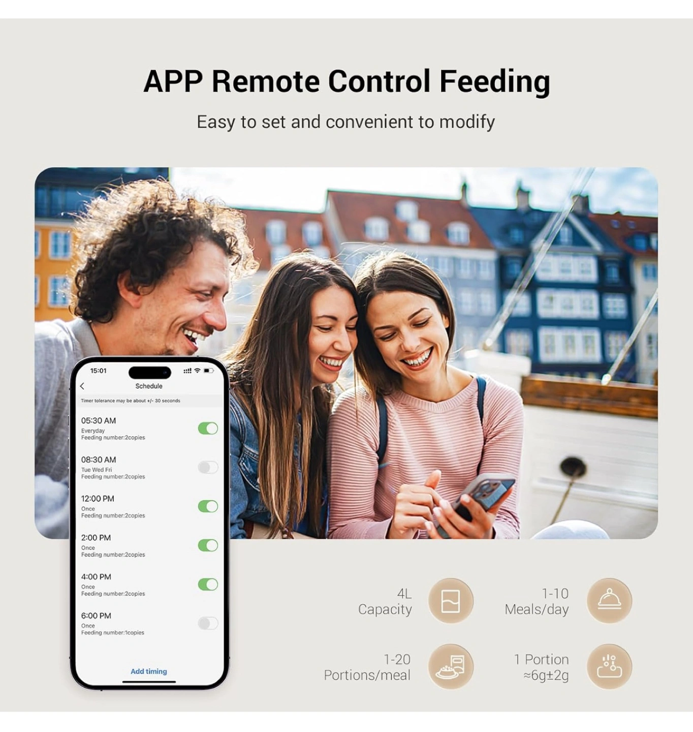 Build A Healthy Diet: Set appropriate feeding schedules and portions to help your pet develop healthy eating habits; reduces the risk of health issues caused by overeating; 4 L food container includes a desiccant box to maintain food freshness and keep your pet's appetite strong; your pet is fed on schedule, even when you're at work or traveling