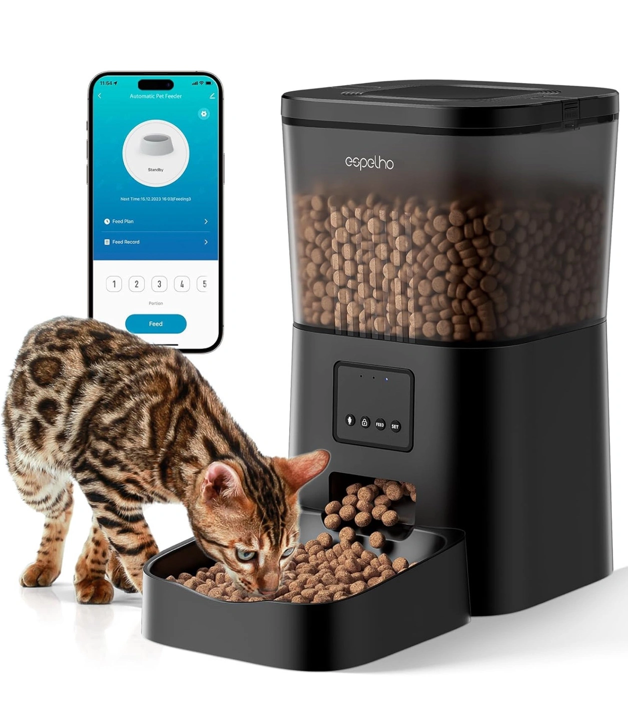 User-Friendly App Control: WiFi automatic cat feeder with "PetTech" app lets you create a personalized feeding schedule with a few taps; manage your pet's meals from anywhere at any time; after connecting to 2.4G WiFi, modify the feeding schedule or remotely feed your pet; set up to 10 meals daily with 1-20 portions per meal; app tracks feeding records and shares them with family members' smartphones(Only support 2.4Ghz WiFi)