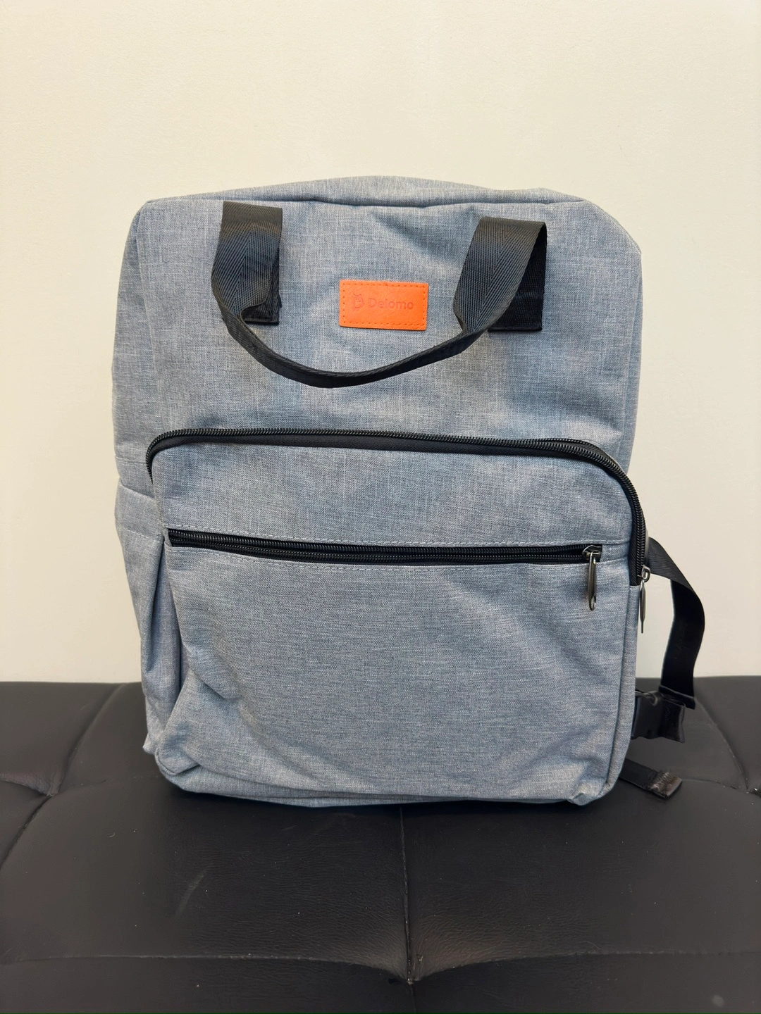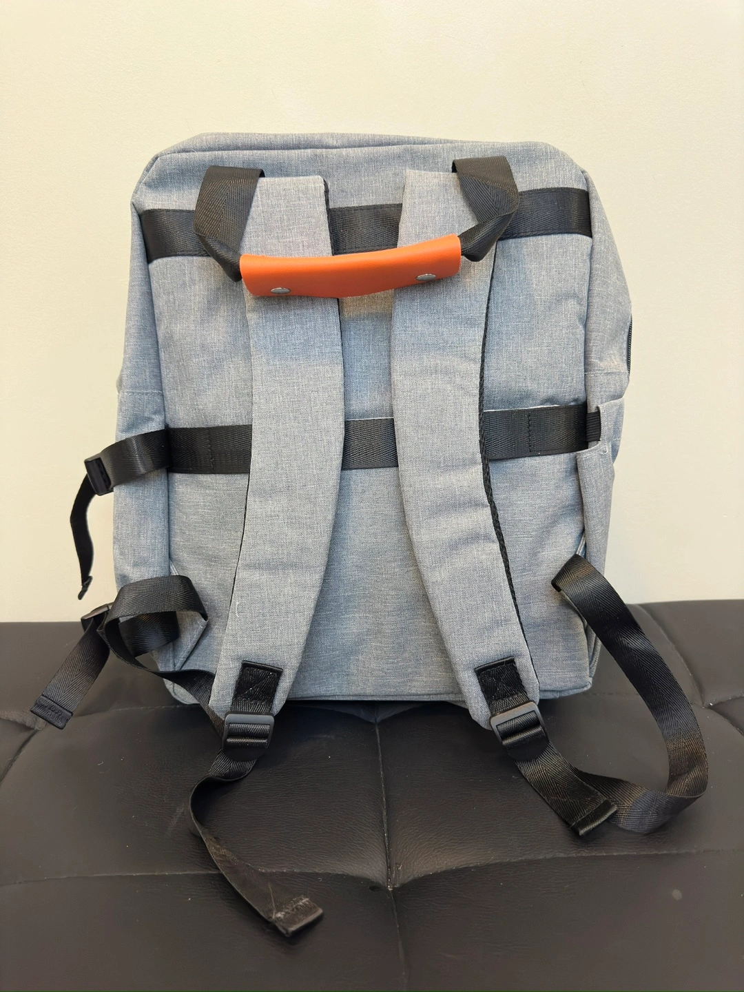 A grey backpack with multiple pockets and carrying straps. Includes two blue bowls. There is also a mat that can be used for easy cleanup of spills or messes. This pet travel backpack is perfect for an enjoyable experience on your next trip.