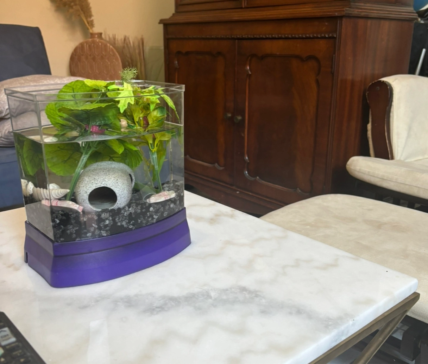 Acrylic tank. Purple base. Includes decorative plants. A great way to bring some natural beauty into your space. Includes a small cave and some pebbles. It has accessories and as well the cover Comes with oxygen pump but not sure if works…