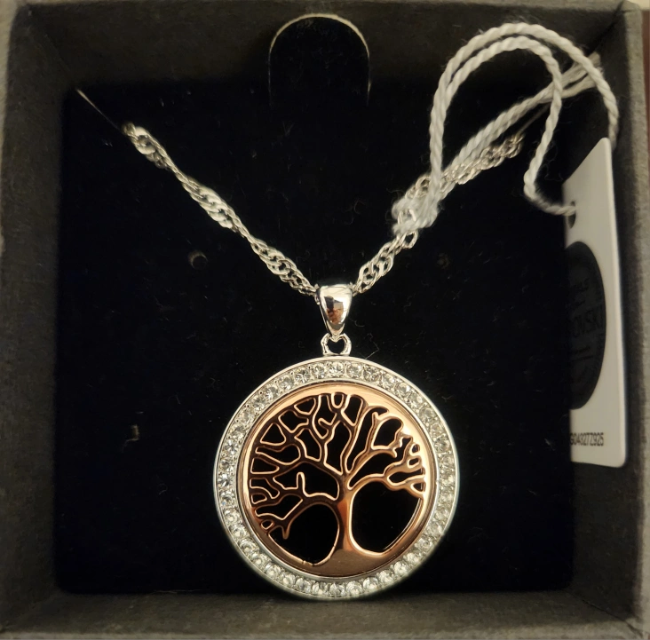 -A sparkling necklace with a tree of life pendant, perfect for completing an outfit or as a special gift. The pendant is round with a tree design within. (with a box)