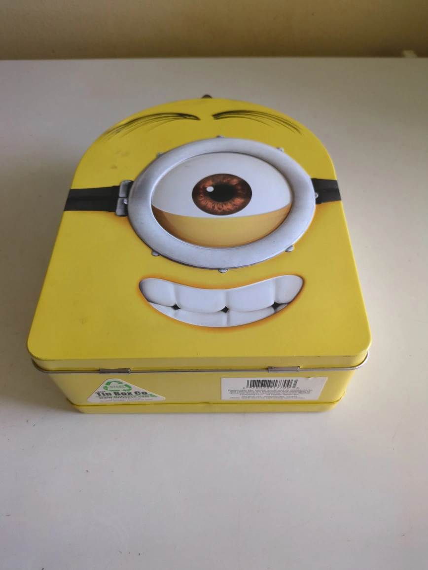 A fun and collectible minion-themed tin box. Features a yellow exterior with a Stuart minion face. Includes a silver metallic trim and blue handle. Great for storing small treasures in a safe place.