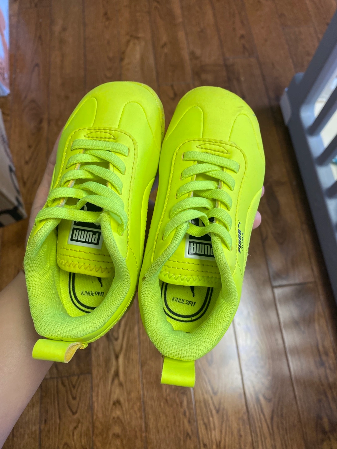These shoes are a vibrant neon yellow colour. They have laces and a padded collar. The soles have a textured pattern for grip. These shoes would be perfect for your little one's first steps.