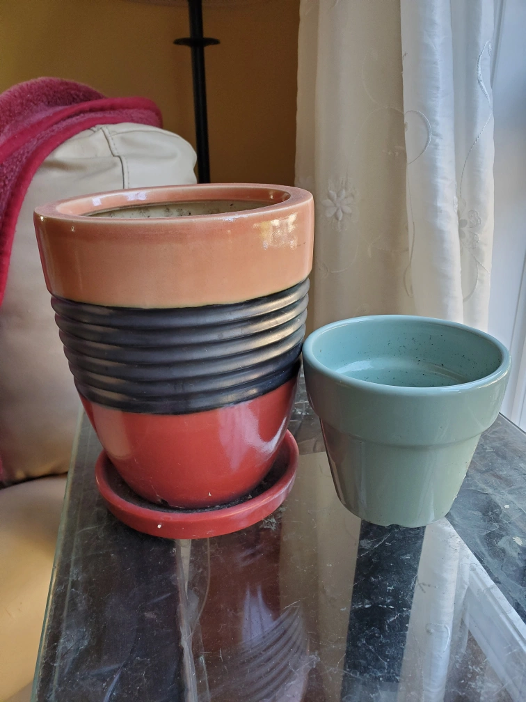 A unique planter with a multi-colored design. Features a red base, a black band in the middle, and a top section in orange. Comes with a matching saucer. Displaying your favorite houseplant in this planter will be a pleasure.