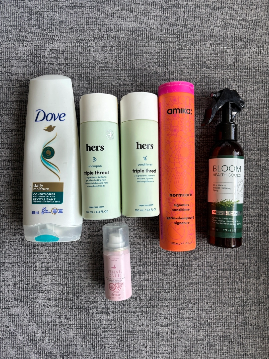 All opened - good amount left to use. Several haircare products shown. There is a conditioner, shampoo, and finishing spray, as well as other products.