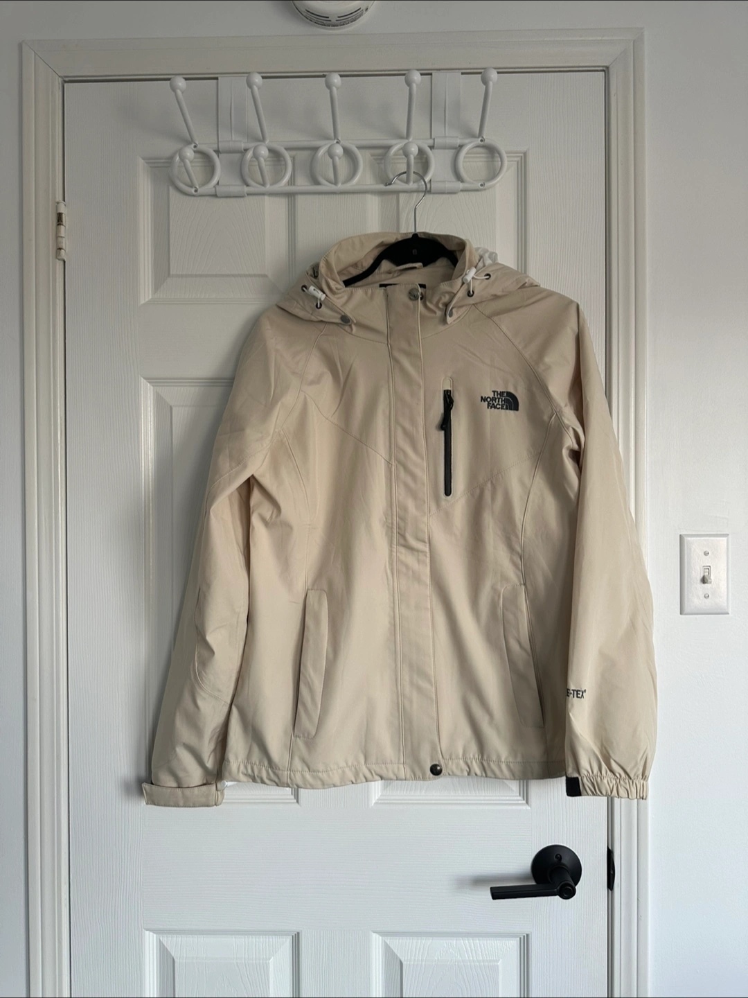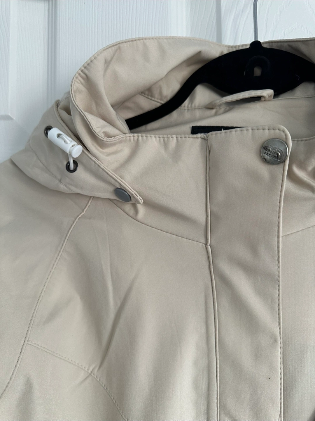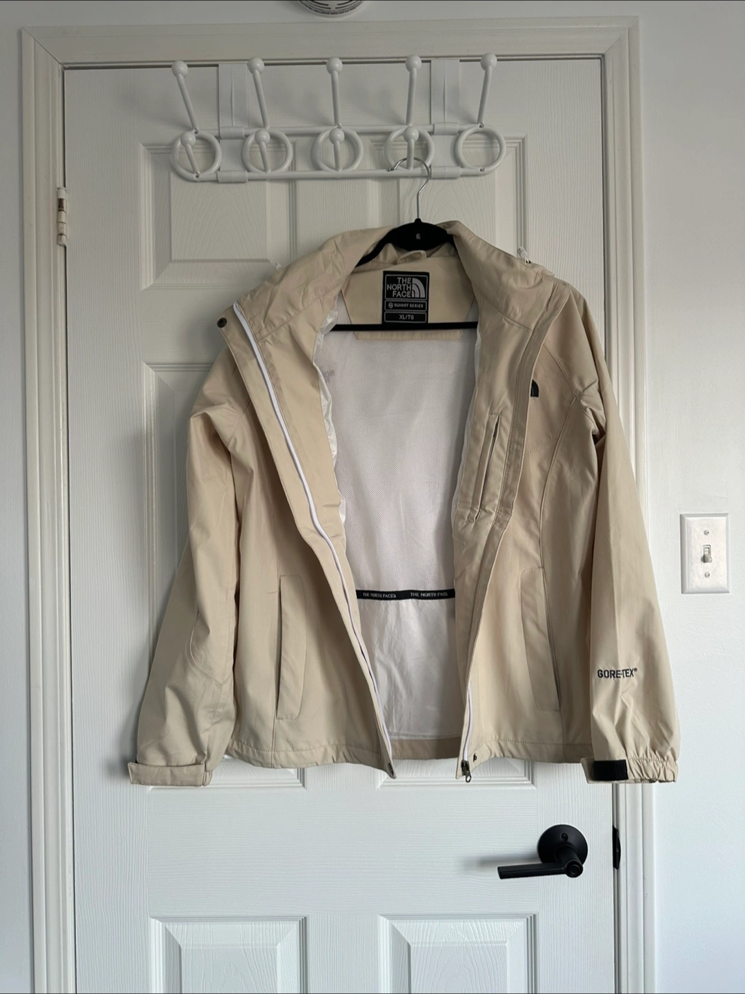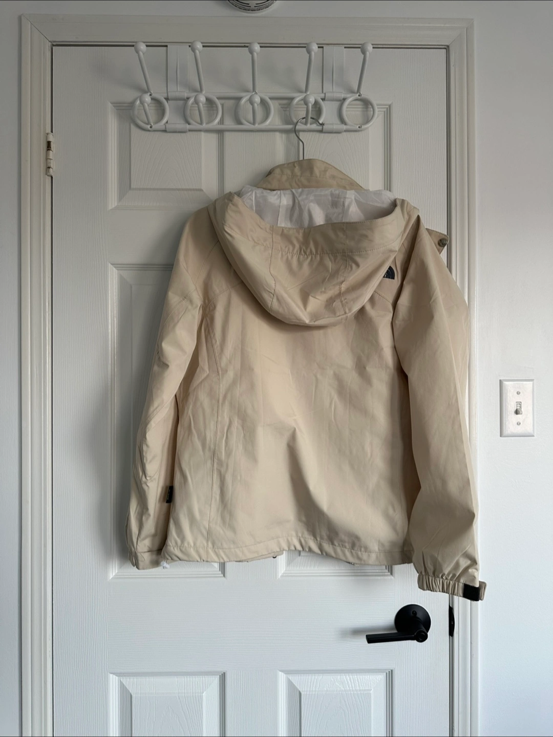 Not genuine. Fits like size L for oversized look. Worn twice. Beige rain jacket. Hooded with a zipper. Has two front pockets. Perfect to wear on a walk in the crisp fall air.