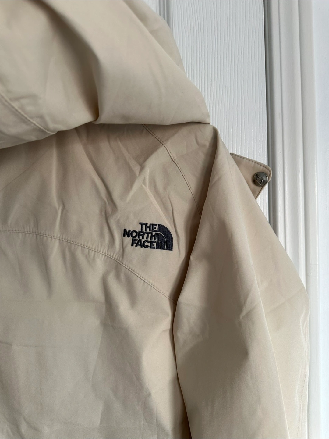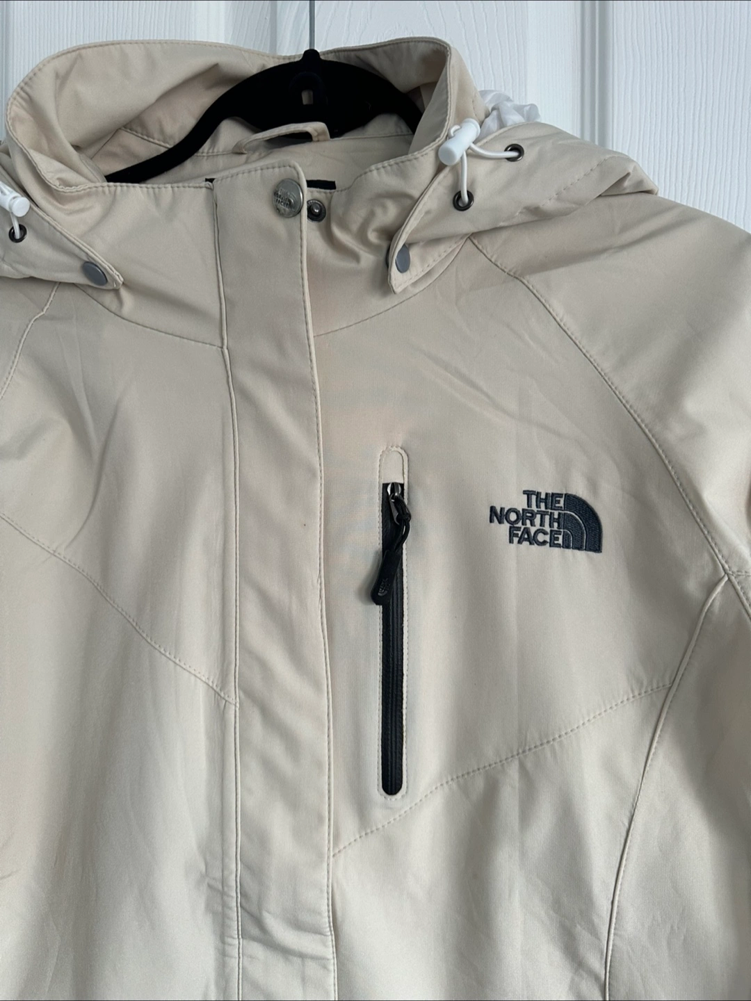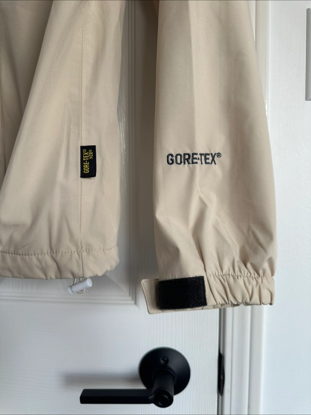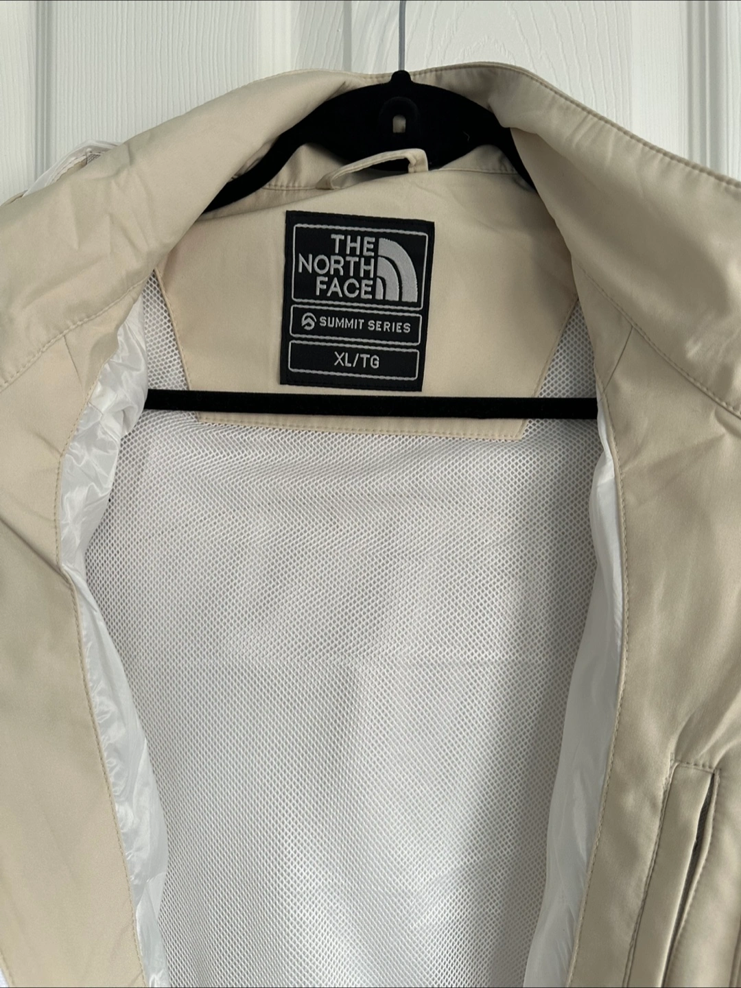 Not genuine. Fits like size L for oversized look. Worn twice. Beige rain jacket. Hooded with a zipper. Has two front pockets. Perfect to wear on a walk in the crisp fall air.