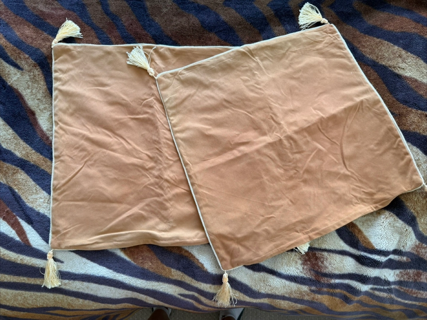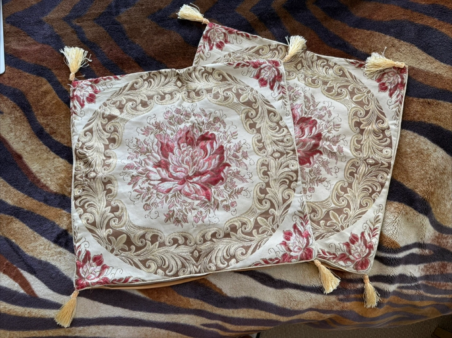 2 pairs of pillowcases, embroidered with lurex thread. Burgundy and beige floral design, tassels, hidden zipper. Size 19”x19”