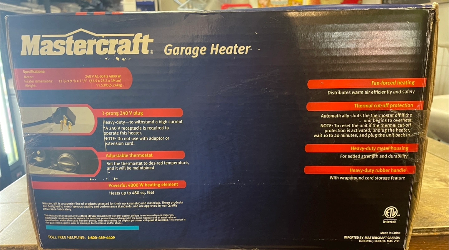 42Garage heater with fan-forced heating, thermal cut-off protection, and adjustable thermostat. This heater is perfect for ensuring a comfortable atmosphere in your workspace. Unopened box.