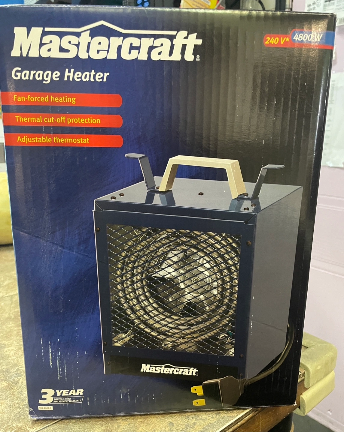Garage heater with fan-forced heating, thermal cut-off protection, and adjustable thermostat. This heater is perfect for ensuring a comfortable atmosphere in your workspace. Unopened box.