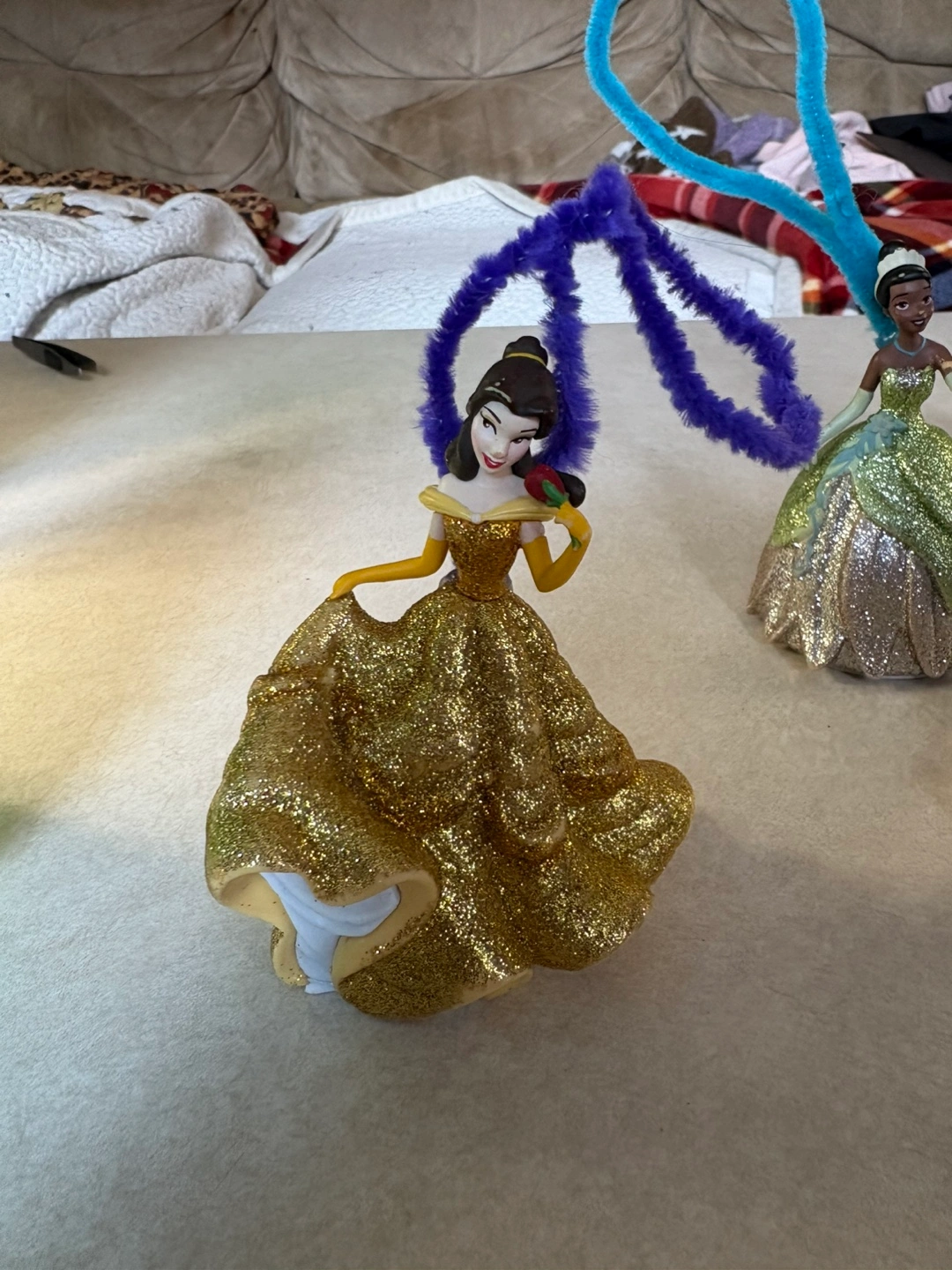 Adorable figurines in a variety of princess costumes. Each of them has a pipe cleaner for hanging them. These would be a charming decoration to add to any space.