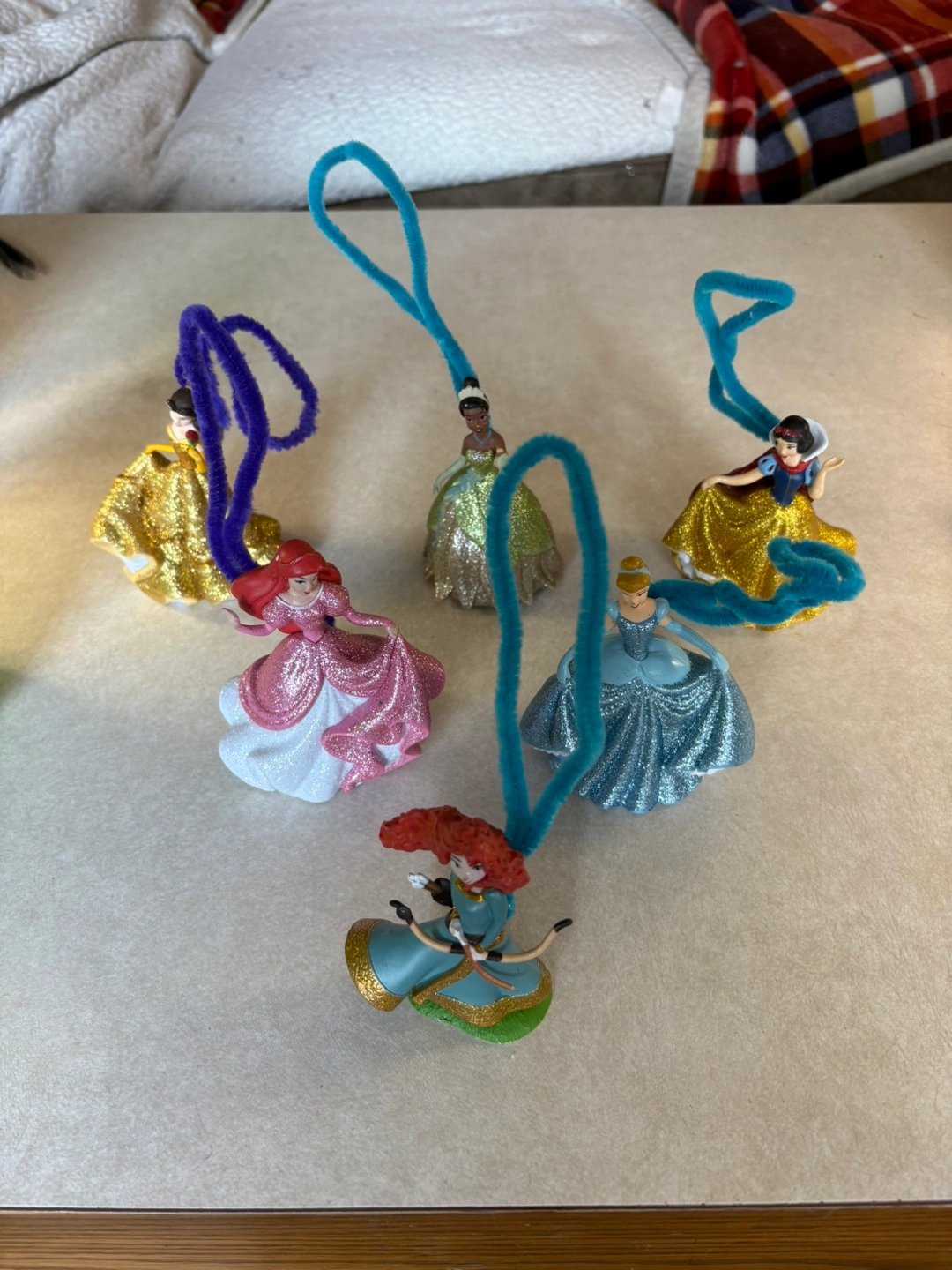 Adorable figurines in a variety of princess costumes. Each of them has a pipe cleaner for hanging them. These would be a charming decoration to add to any space.