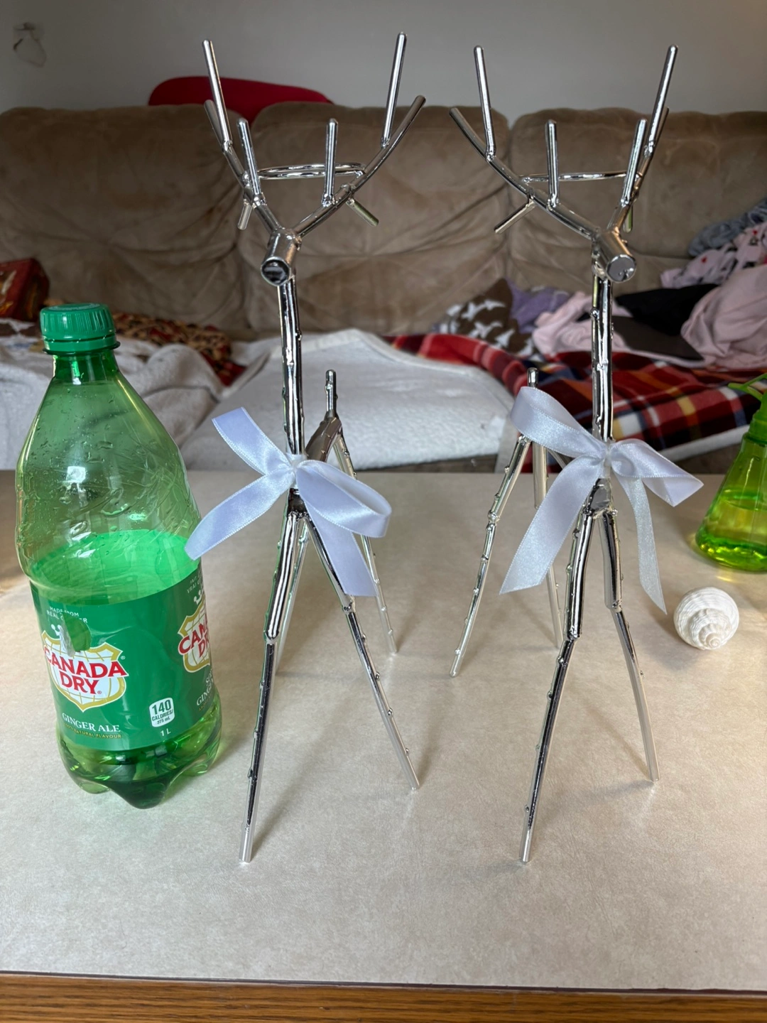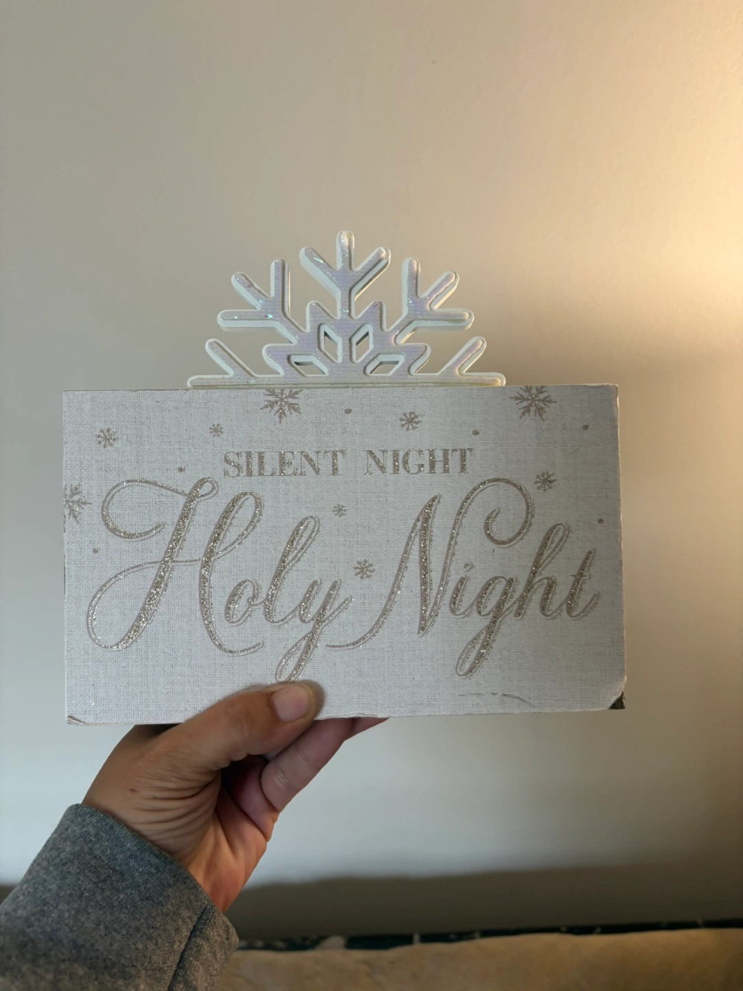 A wonderful bundle of Christmas decorations. Includes a pair of silver reindeers with white bows ($10). A dancing Santa figurine($5), perfect for a shelf. A Silent Night wall decoration($5). Lastly, a gingerbread man candle holder($3). These decorations can create a festive and inviting atmosphere.
