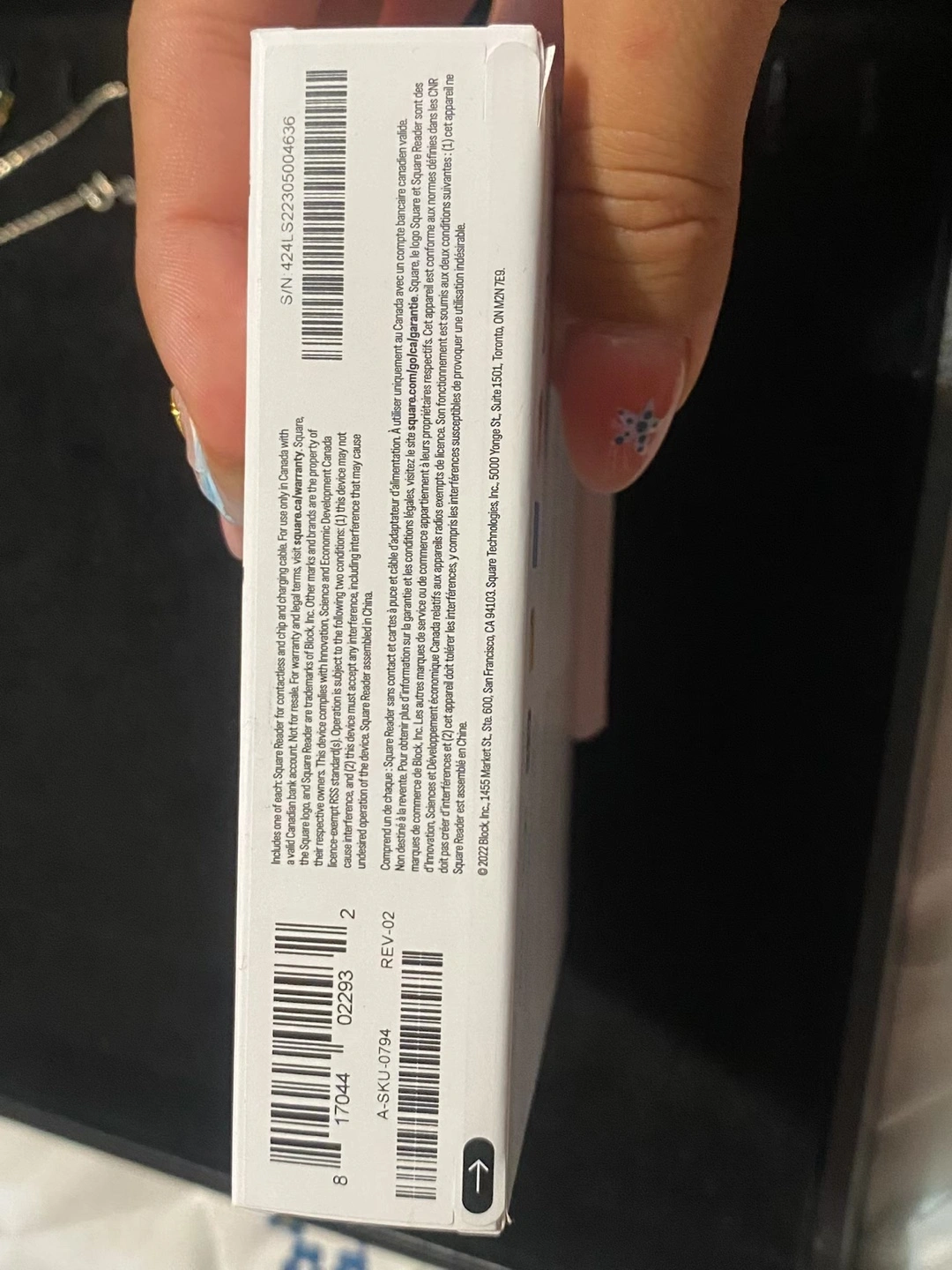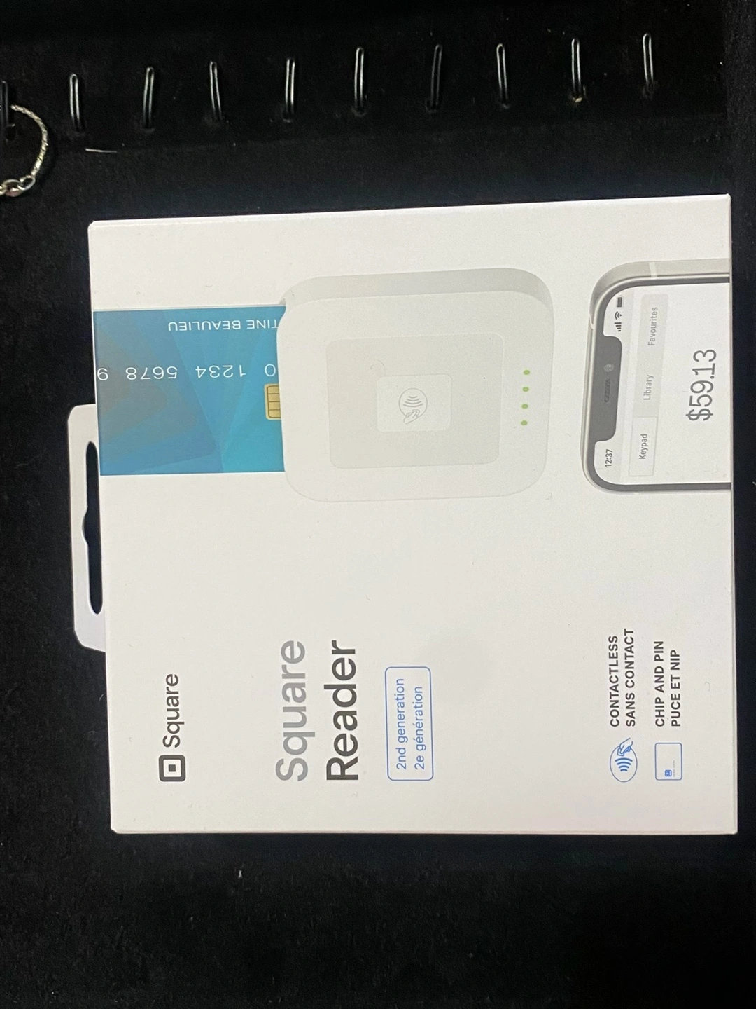 Square reader, still in its original packaging. You could use it to help a small business thrive. The box displays the product and its features.