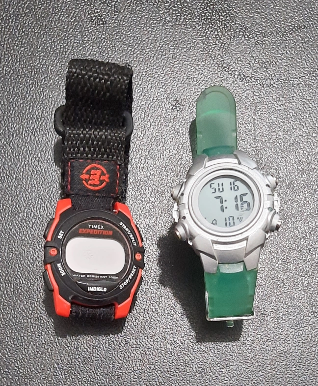 A couple of watches that would be useful for tracking time during your workouts, or any daily activity. The watches include a digital display and various buttons. One watch is red and black with a fabric strap. The other watch has a silver face and a green strap.