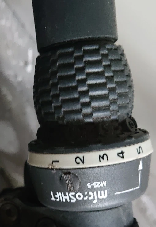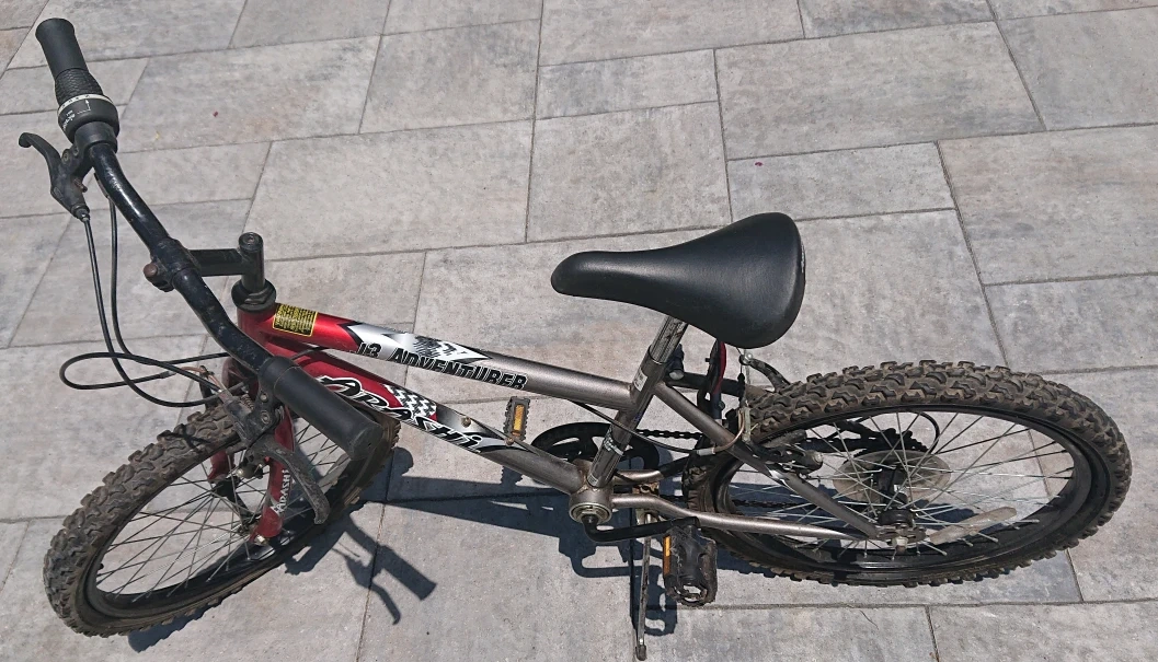 A youth bicycle with a red and grey frame. Features a black seat and black handlebars with multi-gear change for 5-speed. For children age 4-8. Free helmet if you pay the asking price.
