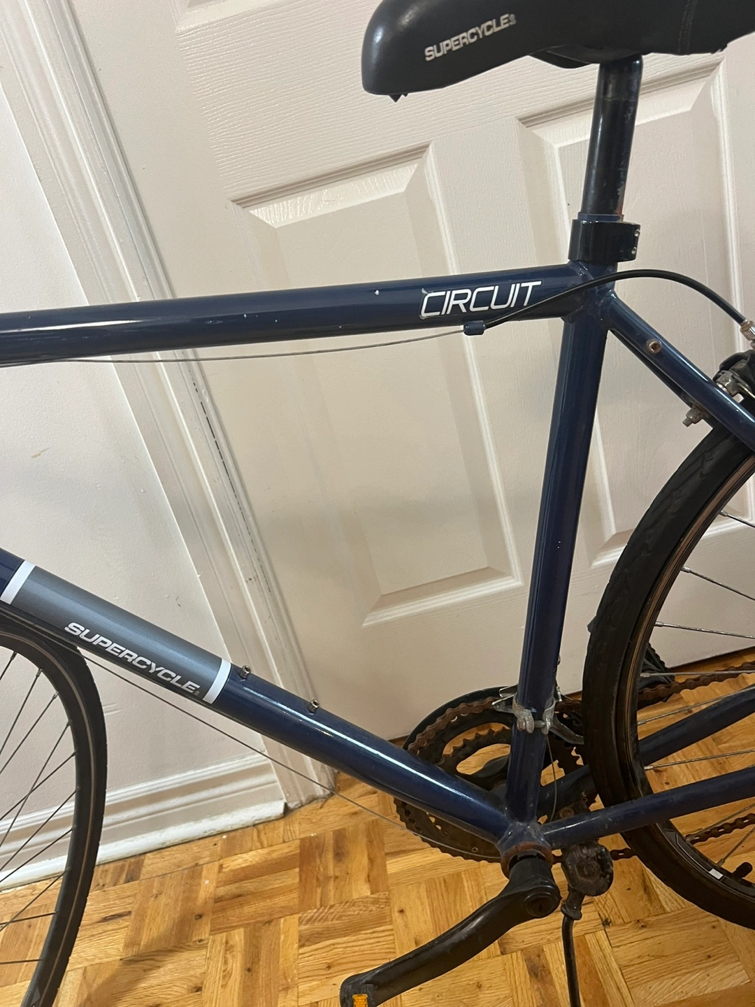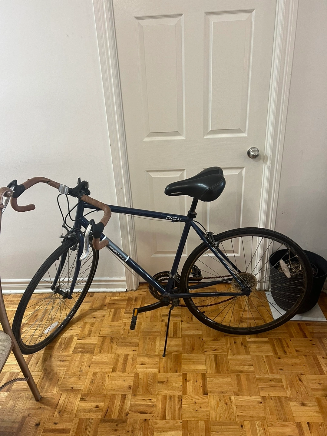 Road bike with drop handlebars. Features a black seat and wheels. Great for taking a leisurely ride on a sunny day.