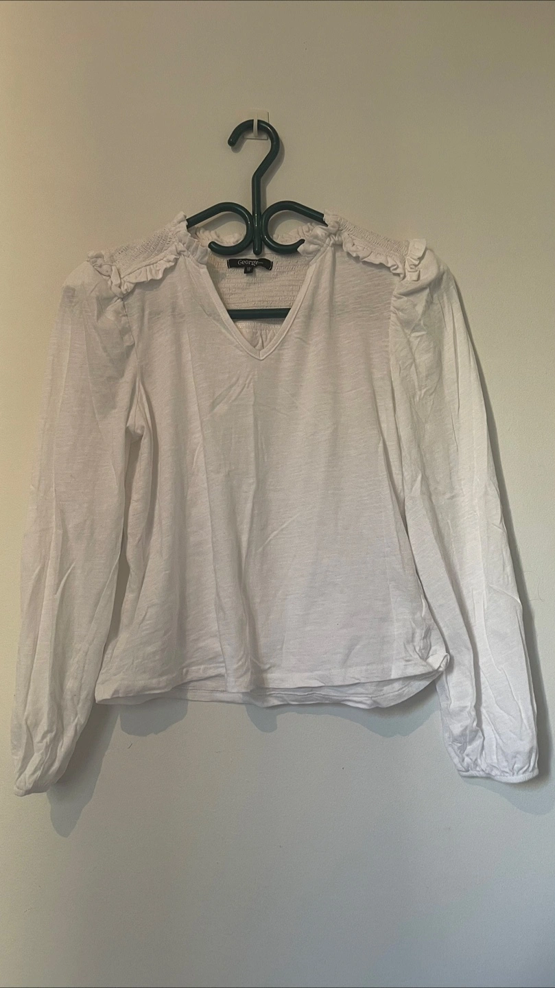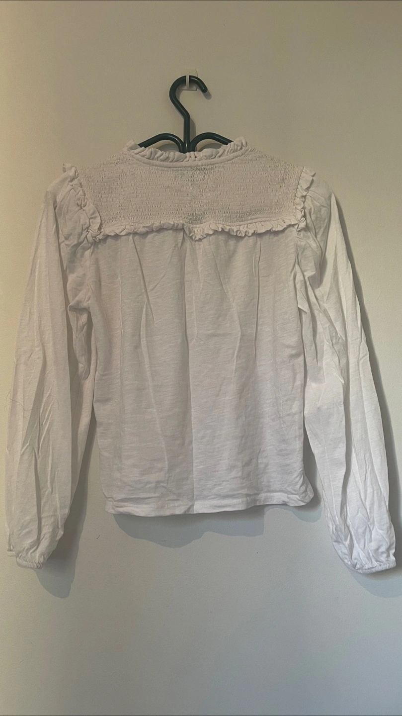 White blouse. Long sleeves. Smocked detail across the back. V-neck cut. Perfect to wear for a comfortable day out or a cozy evening at home.