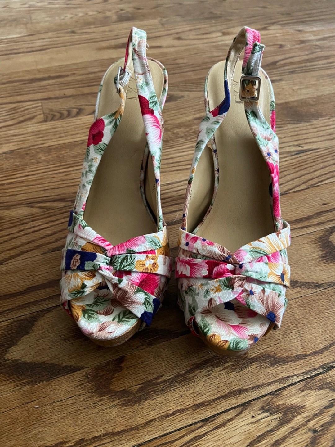 Beautiful heels with a floral print. Cork-style heels. Slingback design. Perfect for a summer stroll or a warm afternoon get-together.