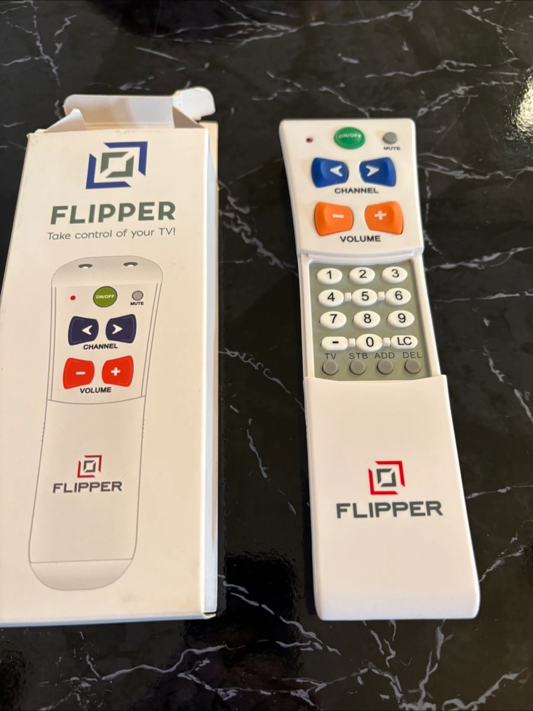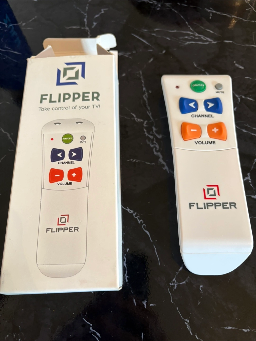 I am offering a FLIPPER remote control. It is white, and includes a box. It has big buttons, perfect for anyone who needs a little assistance enjoying television.