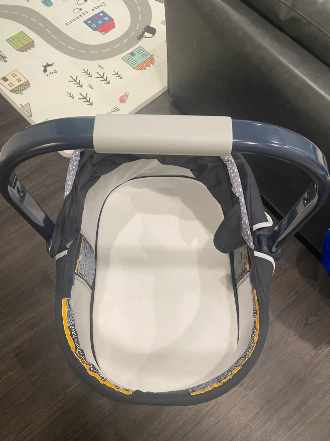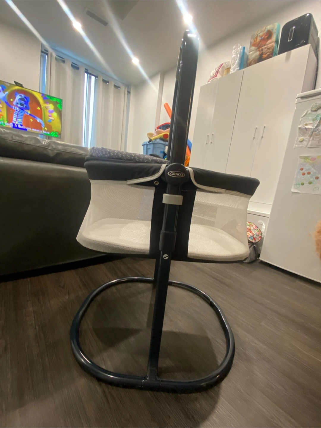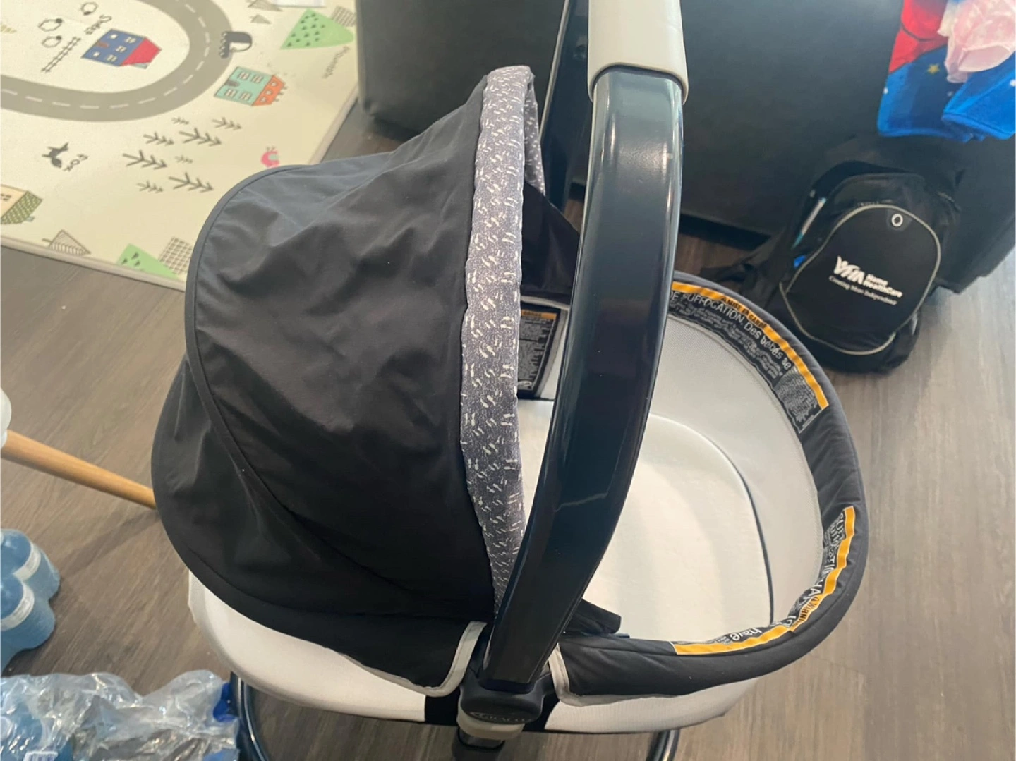 Grey and white colour scheme. Includes mesh lining so you can see your little one, as well as a grey handle. It can be raised to 3 different heights to match the height of your bed. It was barely used because apparently I birth tall babies. Excellent condition.