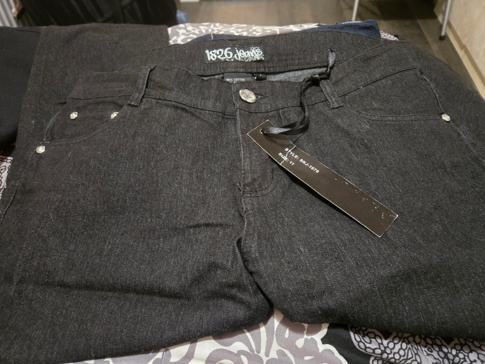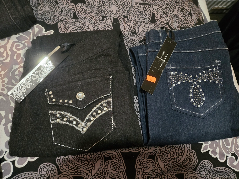 A pair of Black dark-wash jeans with a tag still attached. Detailed pockets, embellished with rhinestones. These jeans would be perfect for a relaxing day or night out. Dark navy option also. origional $19.99 selling for $15 each or take both for$ 25
