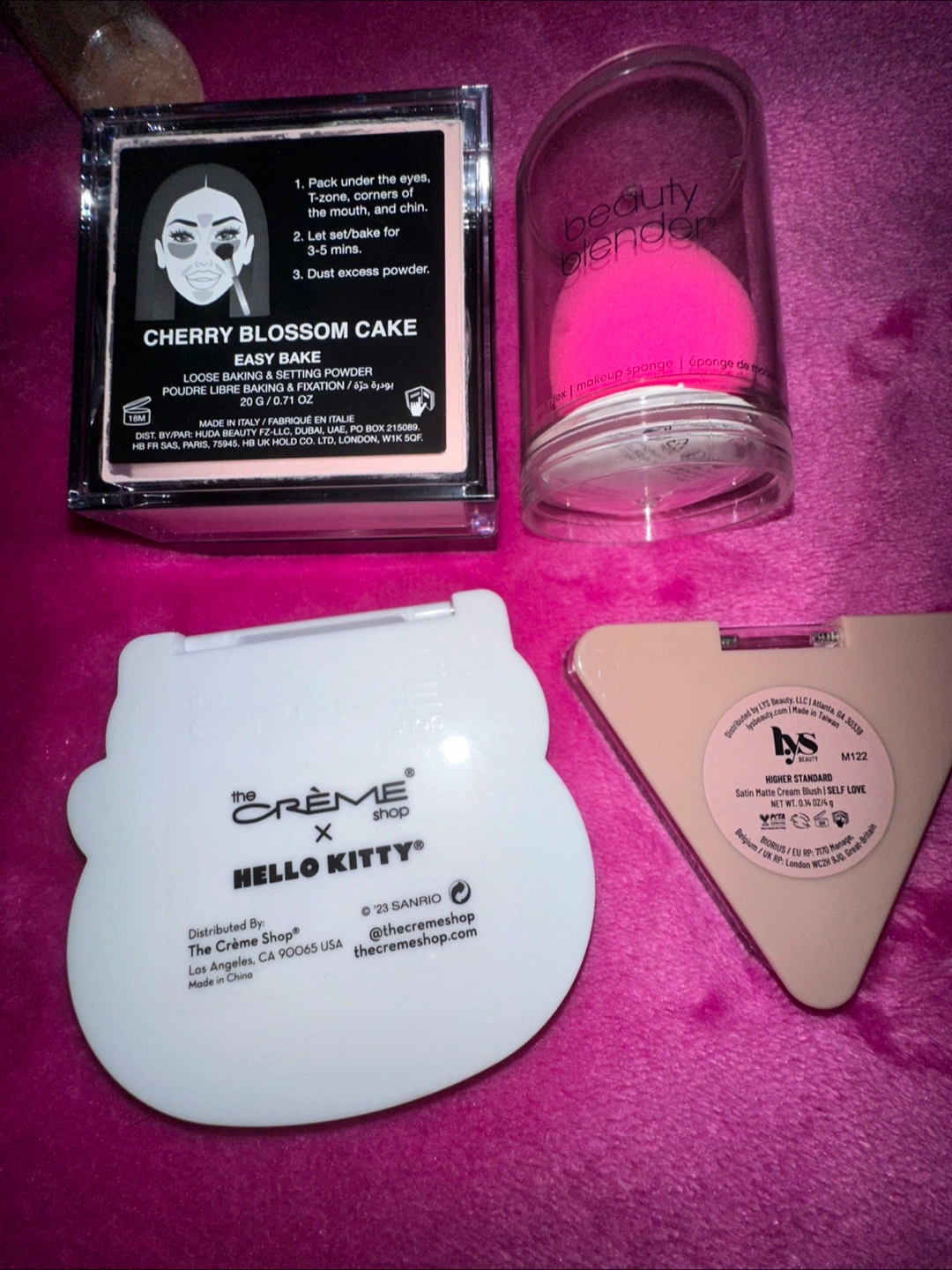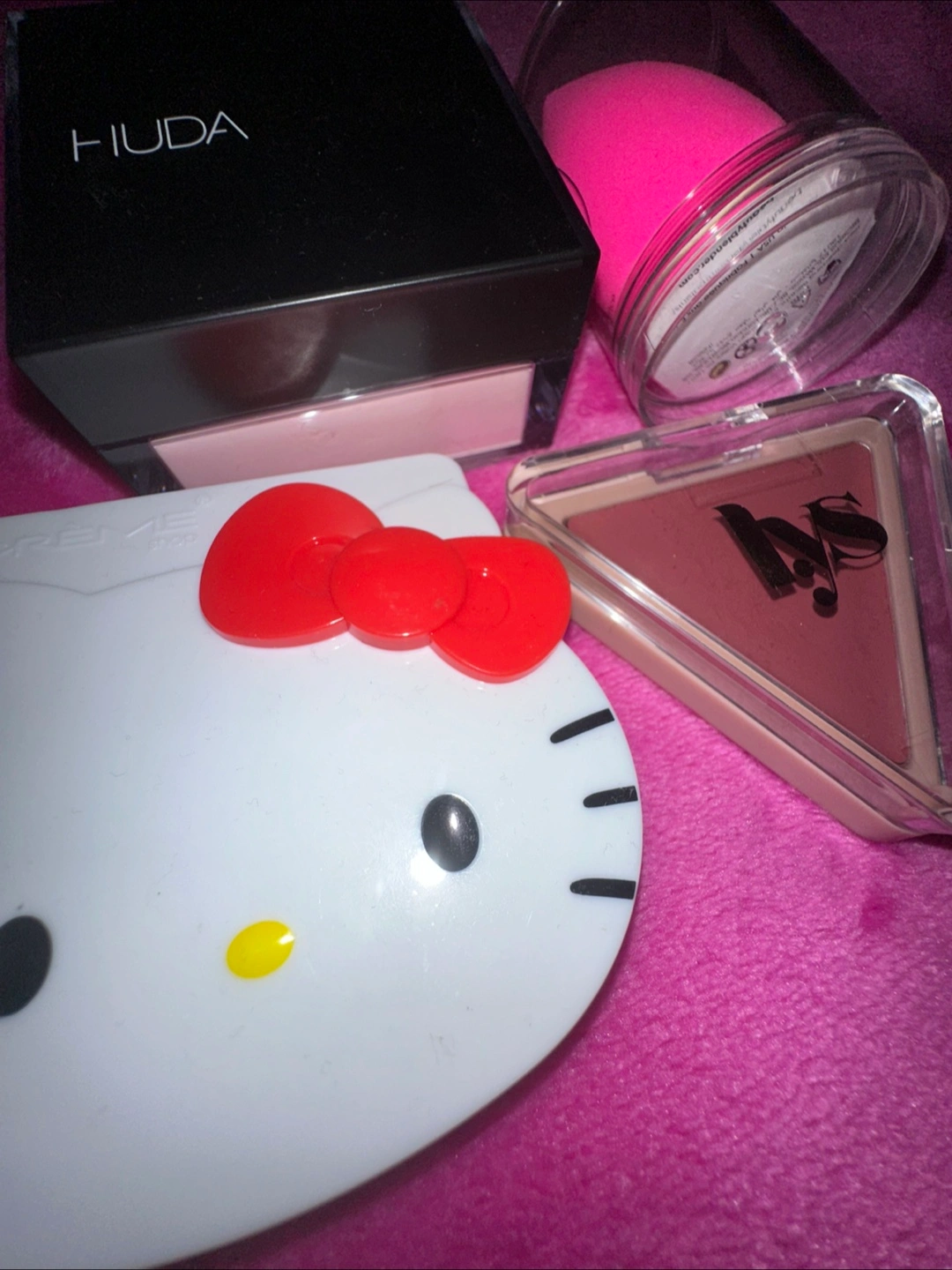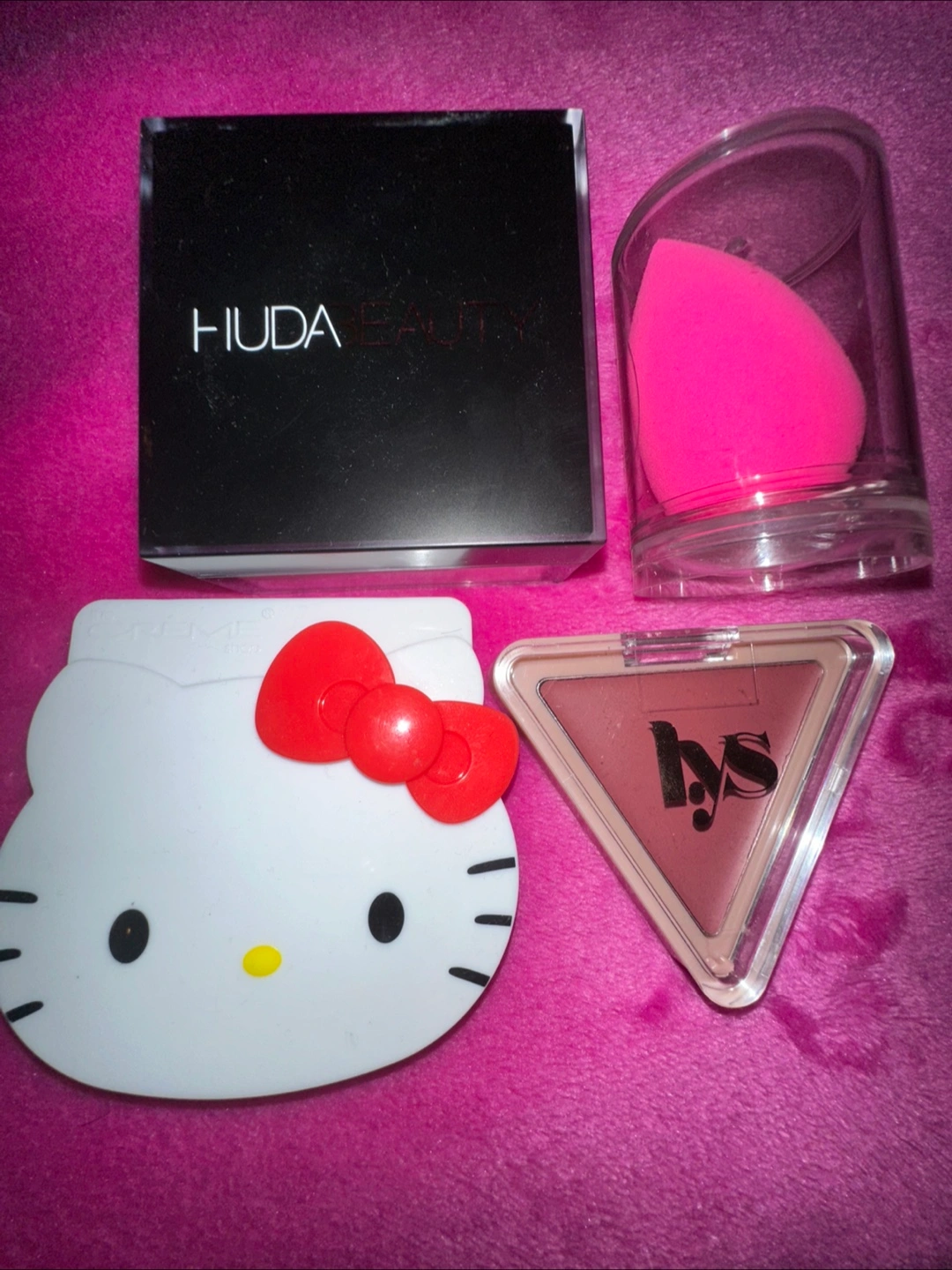 A beauty collection. Including a face sponge. A Hello Kitty compact mirror. The collection also has a blush and a powder, perfect for achieving your favorite looks and a calming, relaxing makeup routine.