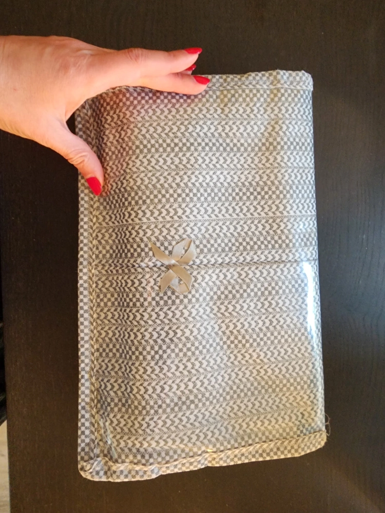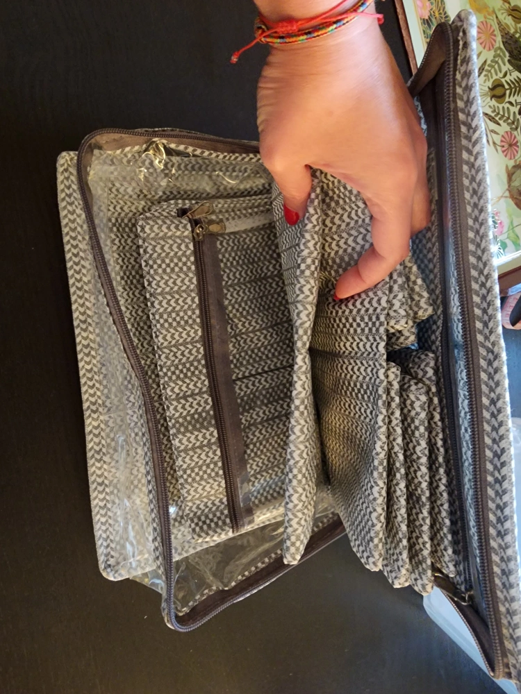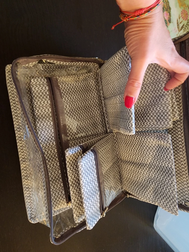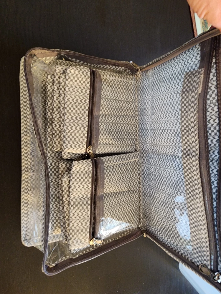 A travel organizer. Features multiple clear plastic pockets with zippers. Fabric has a grey and white pattern. A great way to stay organized on the go.