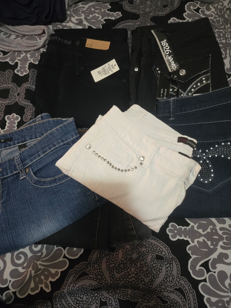 Jeans Jeans Jeans in a variety of colours and styles. Some with embellished pockets. Others feature stud details. A perfect addition to any wardrobe for an everyday look. 3 new with tags $15 each for new/ Used $7-$10