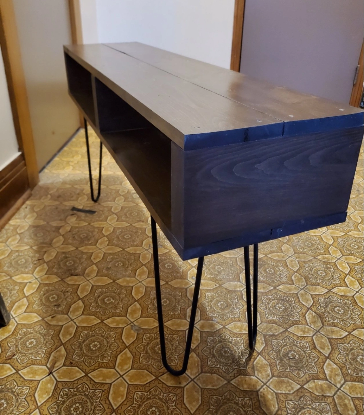 A beautiful bench. Constructed from wood with a dark stain. Features two storage compartments. Supported by black hairpin legs. Use it to organize and style your entryway or living space in a neat way. Great condition, black metal legs with two cubbys for devices. Pickup near Eglinton and Birchmount Main Body W: 44.5" D: 11" H: 7" H with legs: 23" Interior Slots W: 19.5" D: 11" H: 5.5" Must go before 21st June