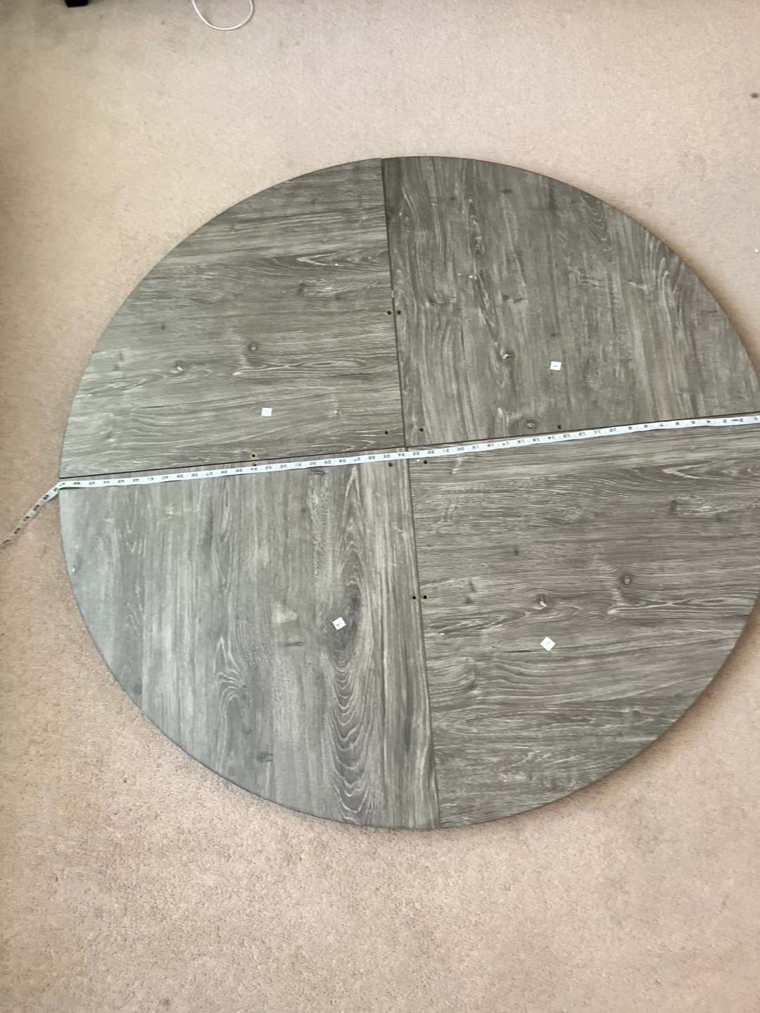 Beautiful dining table. Features a round, wooden table top. The base has a unique, four-legged design. This table would be lovely for sharing meals and conversations with loved ones.
