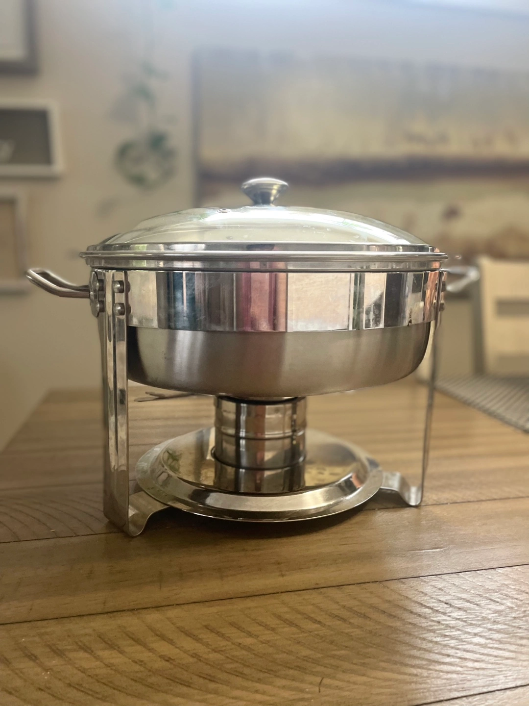 A stylish buffet server, with handles. The top has a clear glass lid with a knob on top. Comes with a sturdy metal stand. It would be lovely to serve your guests with this. I have 3, $35 each