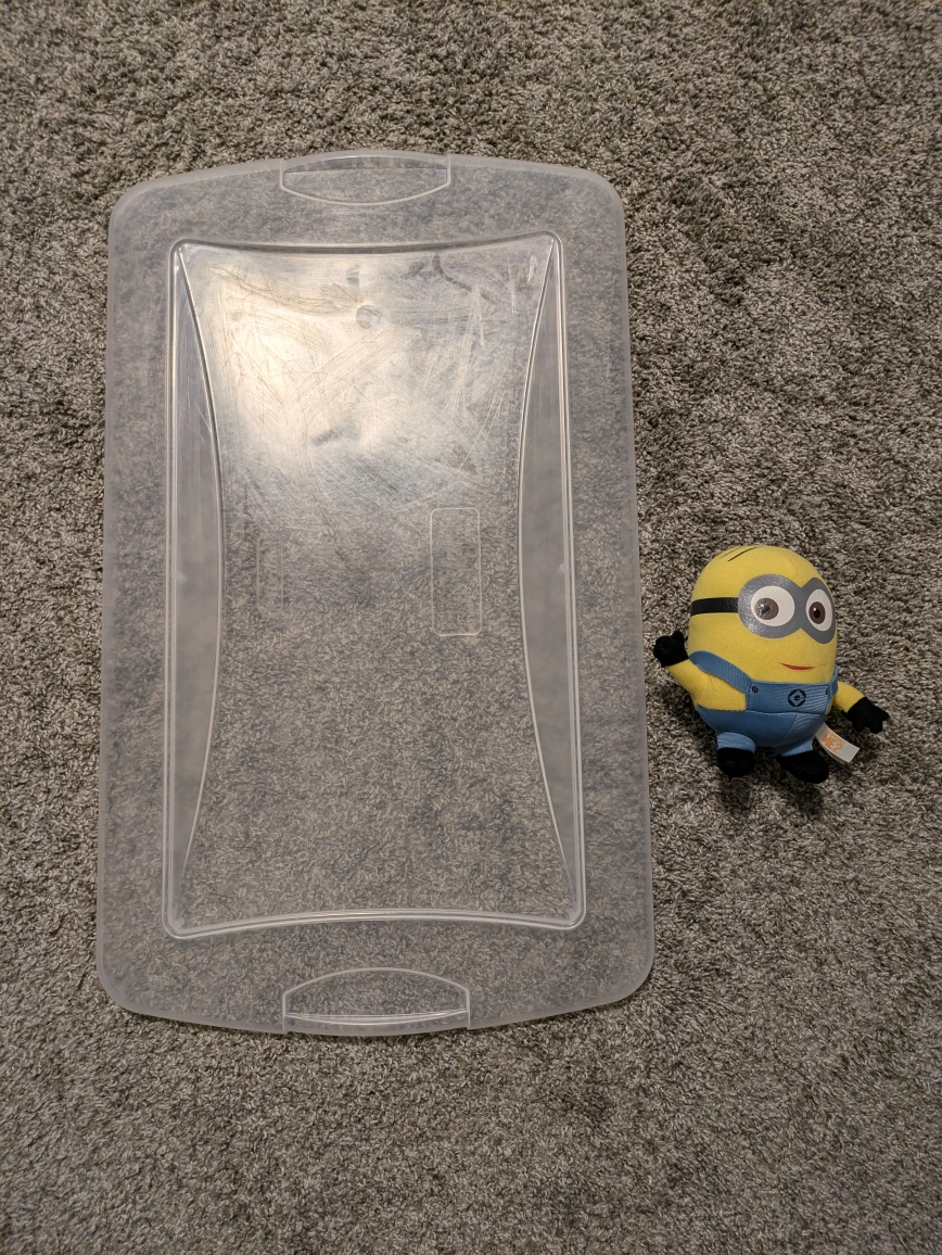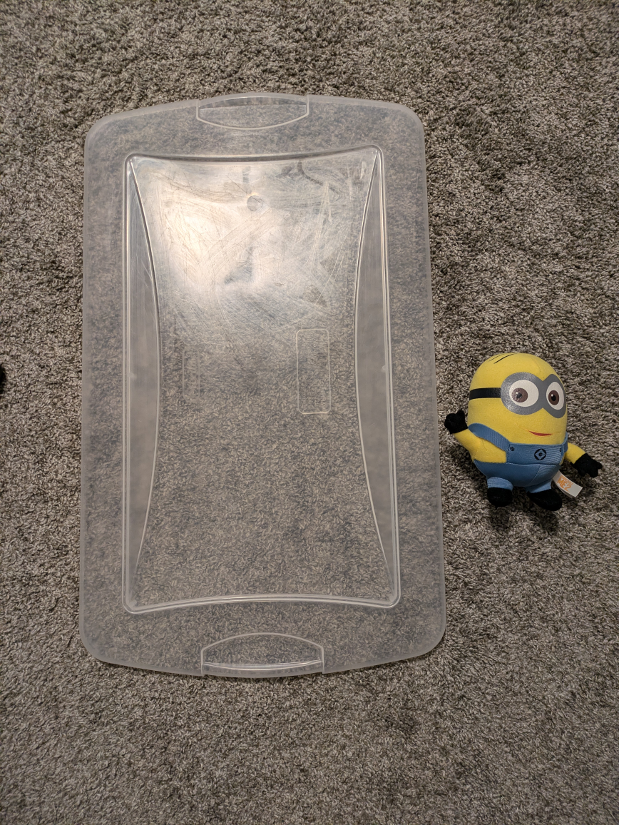 A clear plastic storage container. The lid included. Minion just for size reference NOT included. You can use this container for seasonal decorations. - bin not included