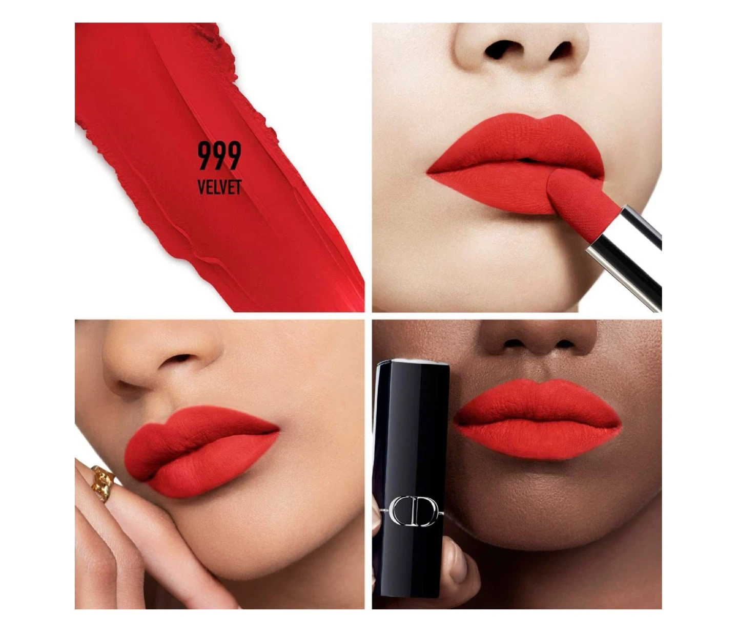 A classic Christian Dior lipstick in a red velvet finish; colour 999. Features a sleek CD black and silver casing. A perfect addition to any make up collection!