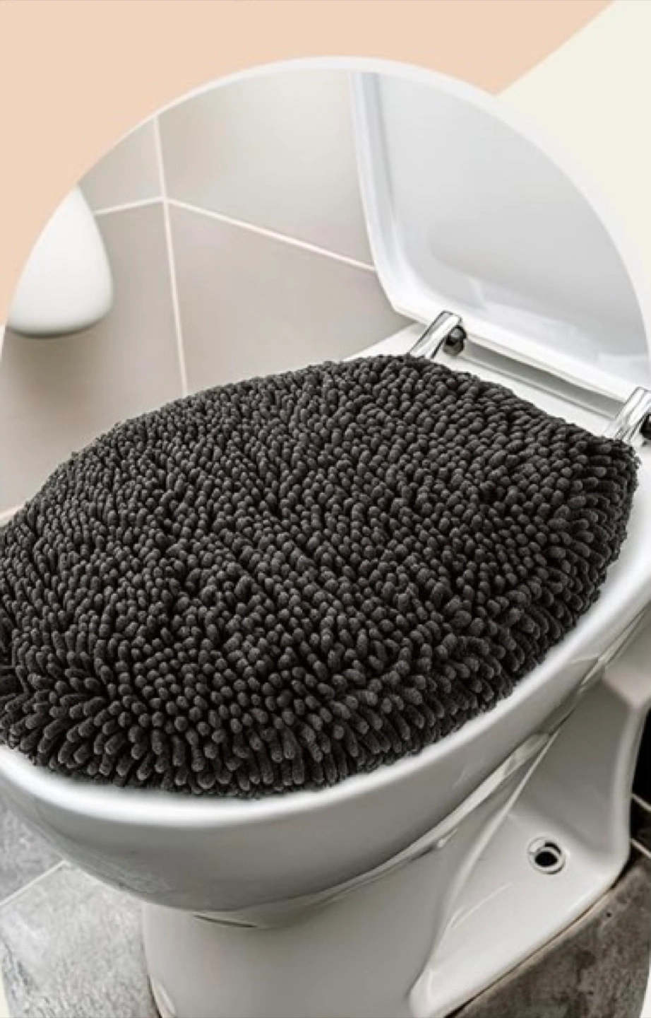A cozy toilet seat cover. Made from soft, fuzzy material. Offers warmth and comfort. These will make your bathroom a cozy and inviting space.