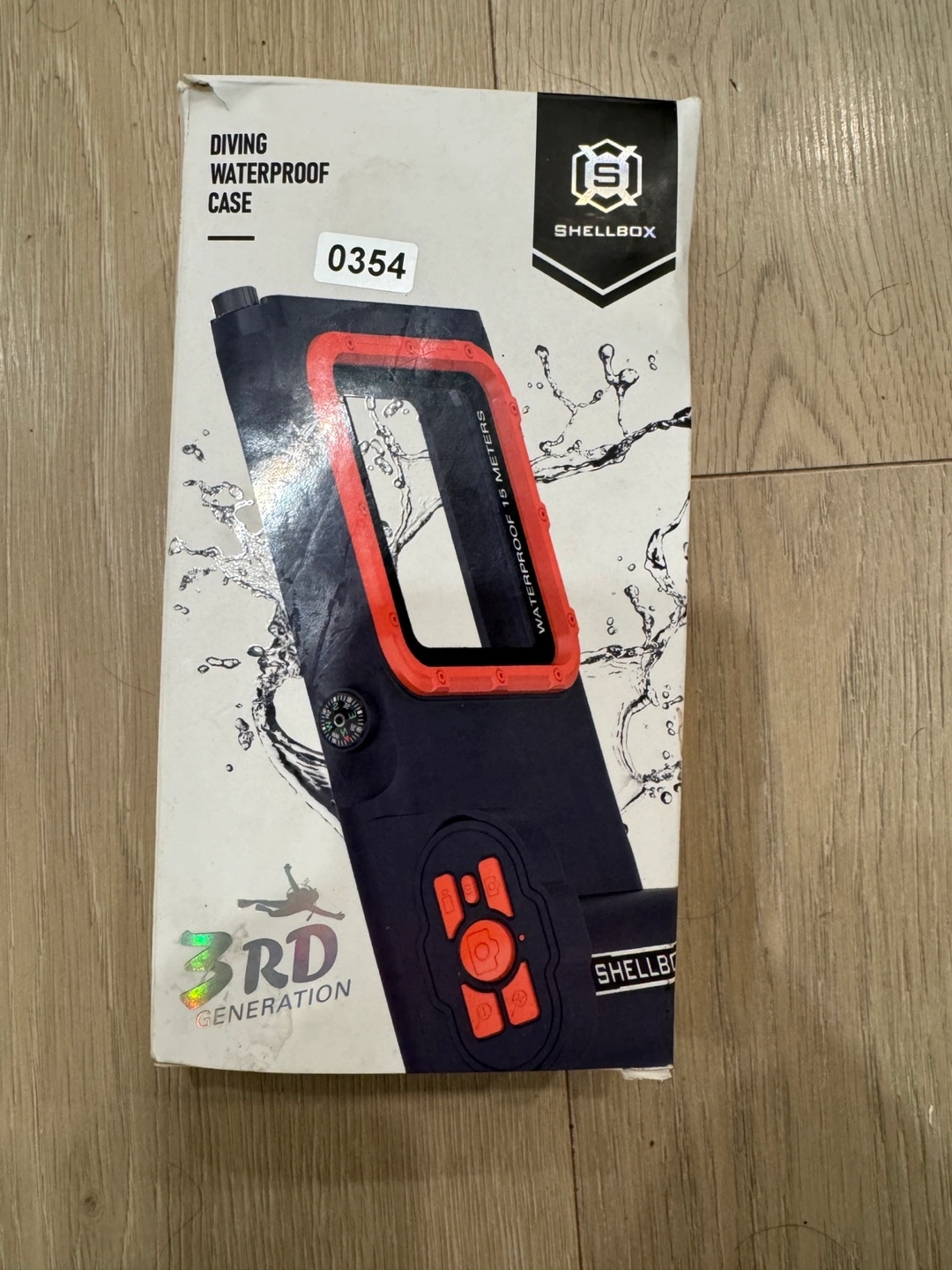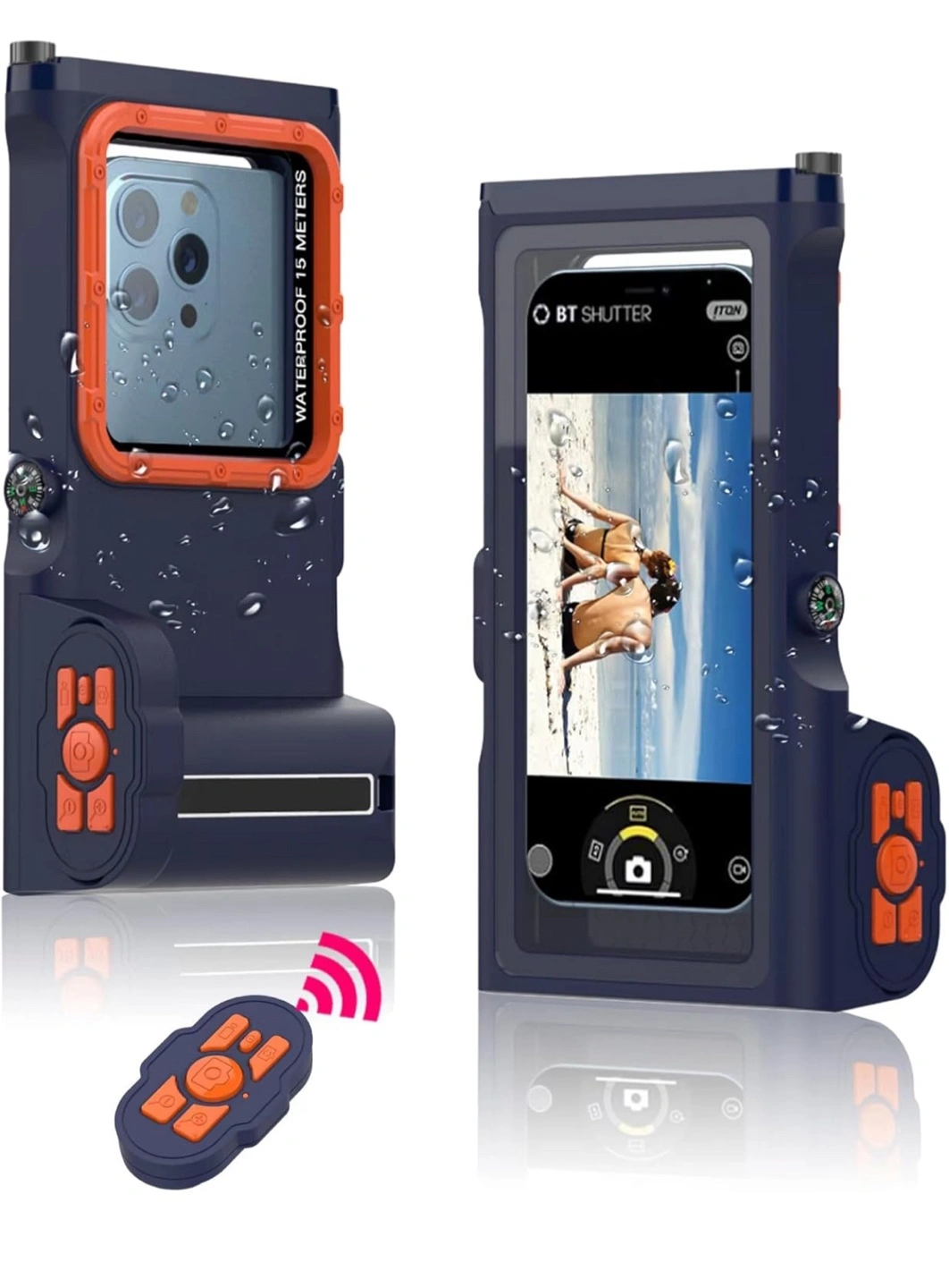 A diving waterproof case. Features buttons and compass. Perfect for those underwater photos. Just imagine, capturing the beauty of the ocean's depths with ease.