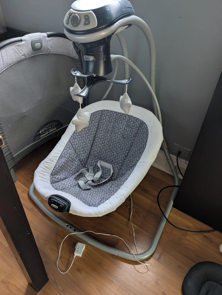A baby swing with a fabric seat. Features a grey and white design. Equipped with a mobile. Could be a lovely place for your little one to take a nap. swings side to side or switch front to back. 3 point harness. plug it in or use the battery option. plays music and vibrates. Pickup only St Clair East and O'Connor