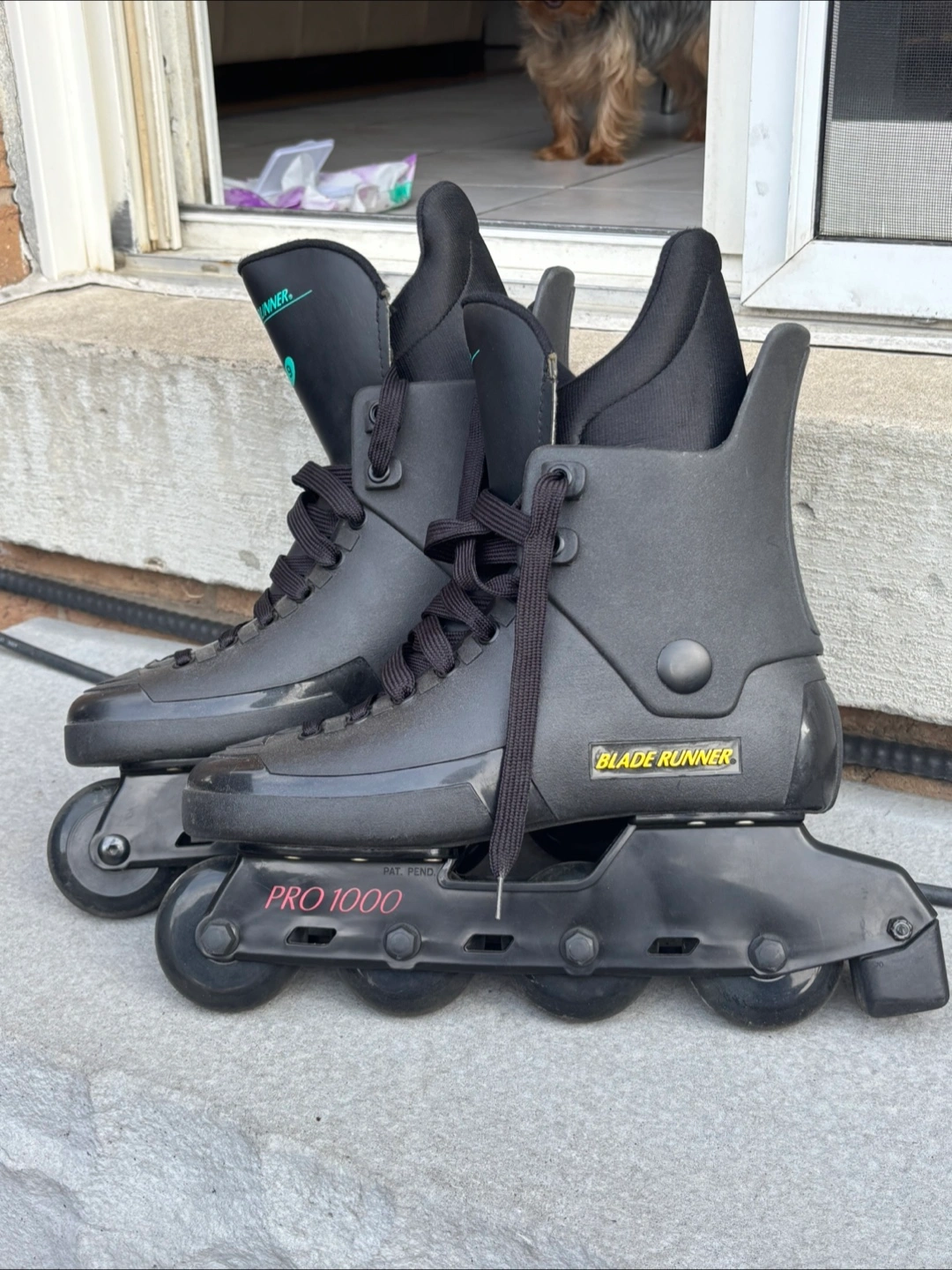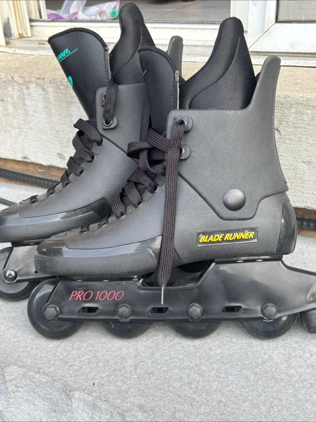 15Black inline skates. Black wheels attached to the base. They have laces to tie them up. These would be great for getting some fresh air. Size 9