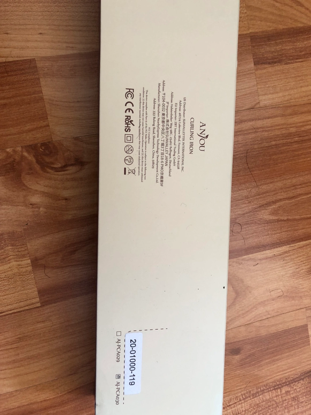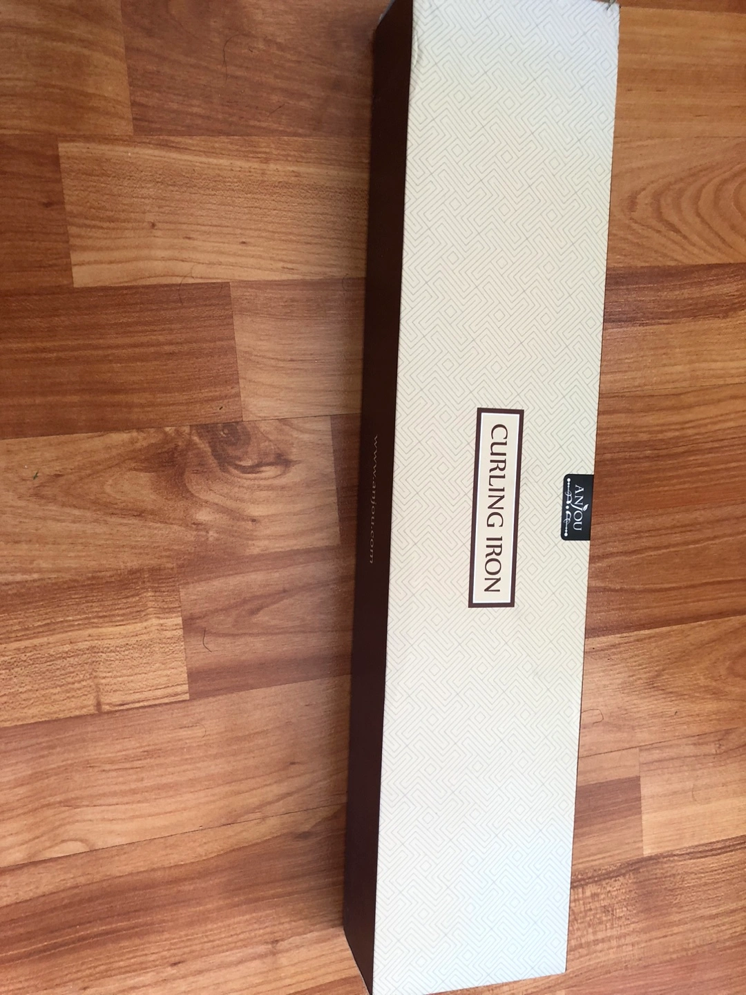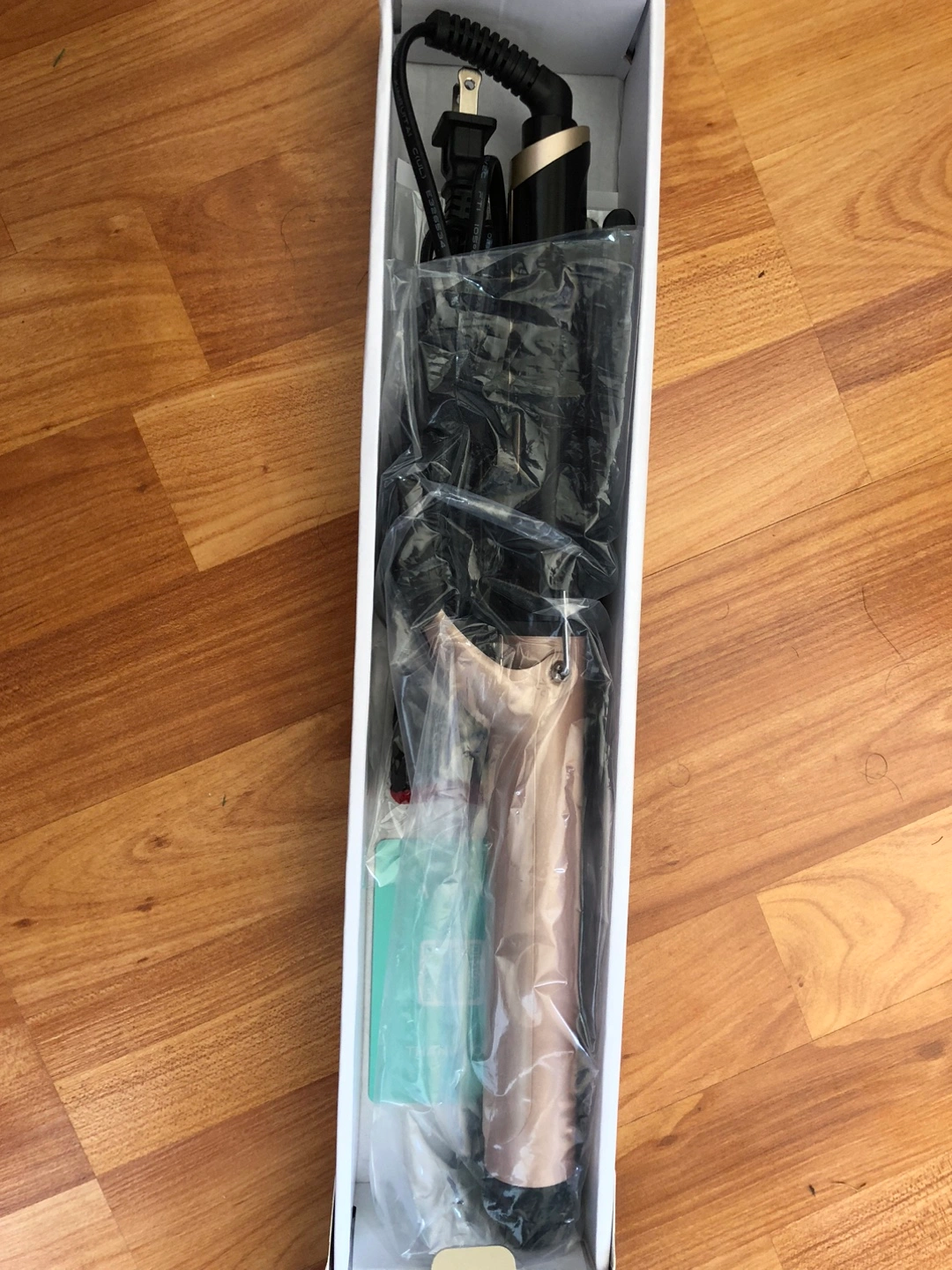 The curling iron appears new, unopened. The box is white with a geometric pattern. Contains the curling iron and accessories, wrapped in plastic. Creating beautiful curls can be a lovely way to start your day.