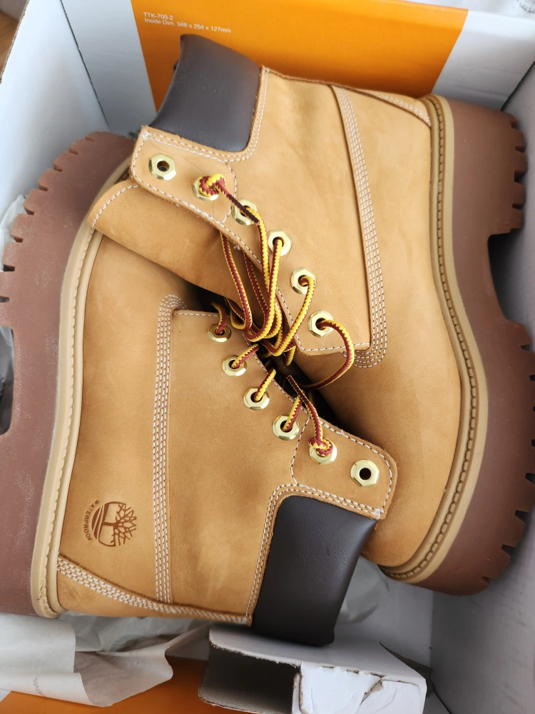 Brand new Timberland boots in the box. The boots have laces, and are made of nubuck. Perfect for a relaxing walk in the fall weather.