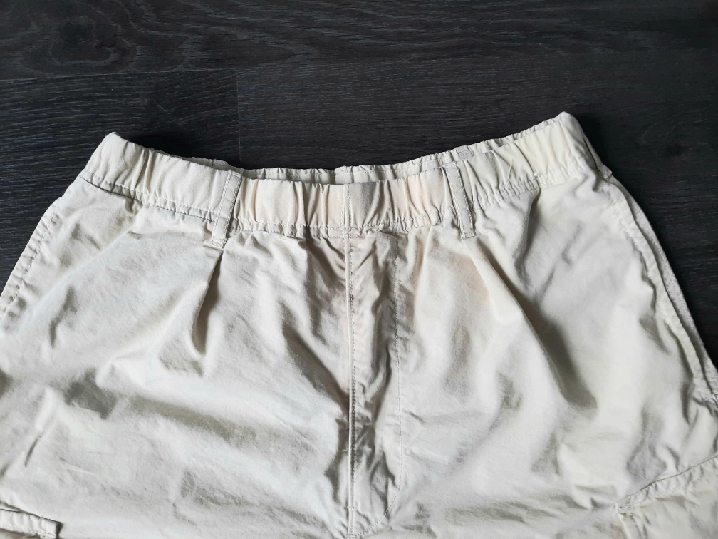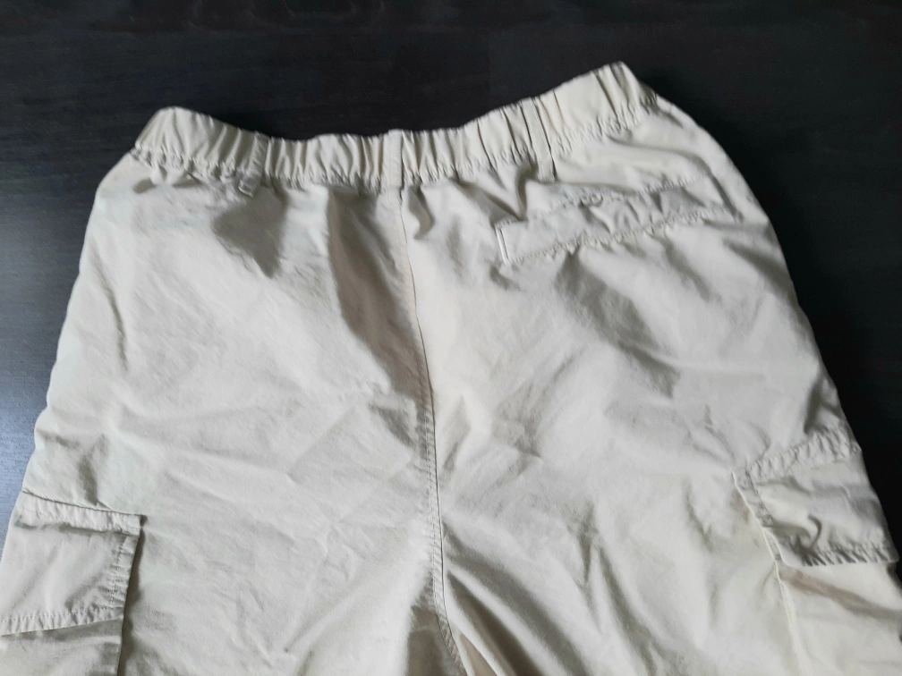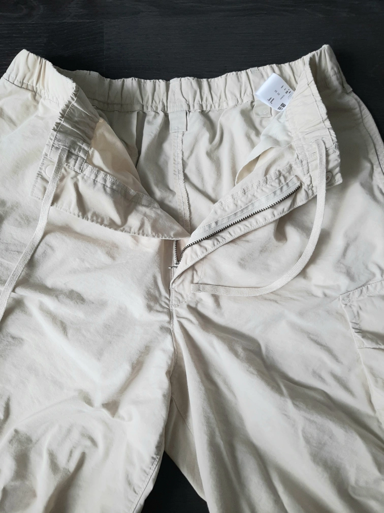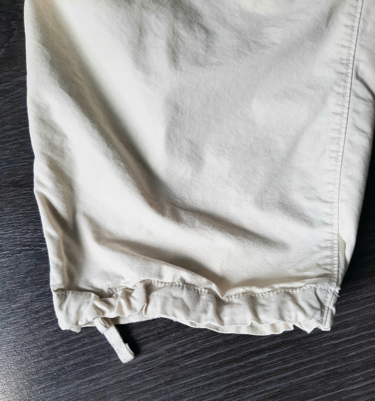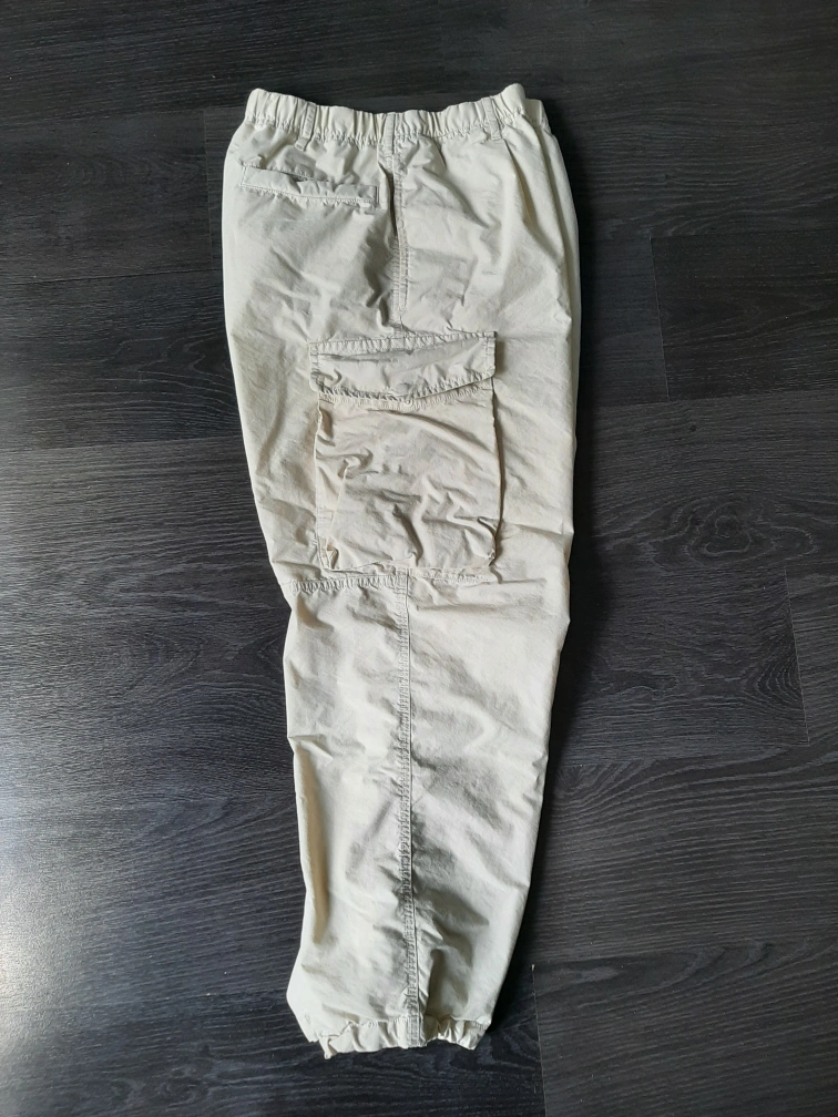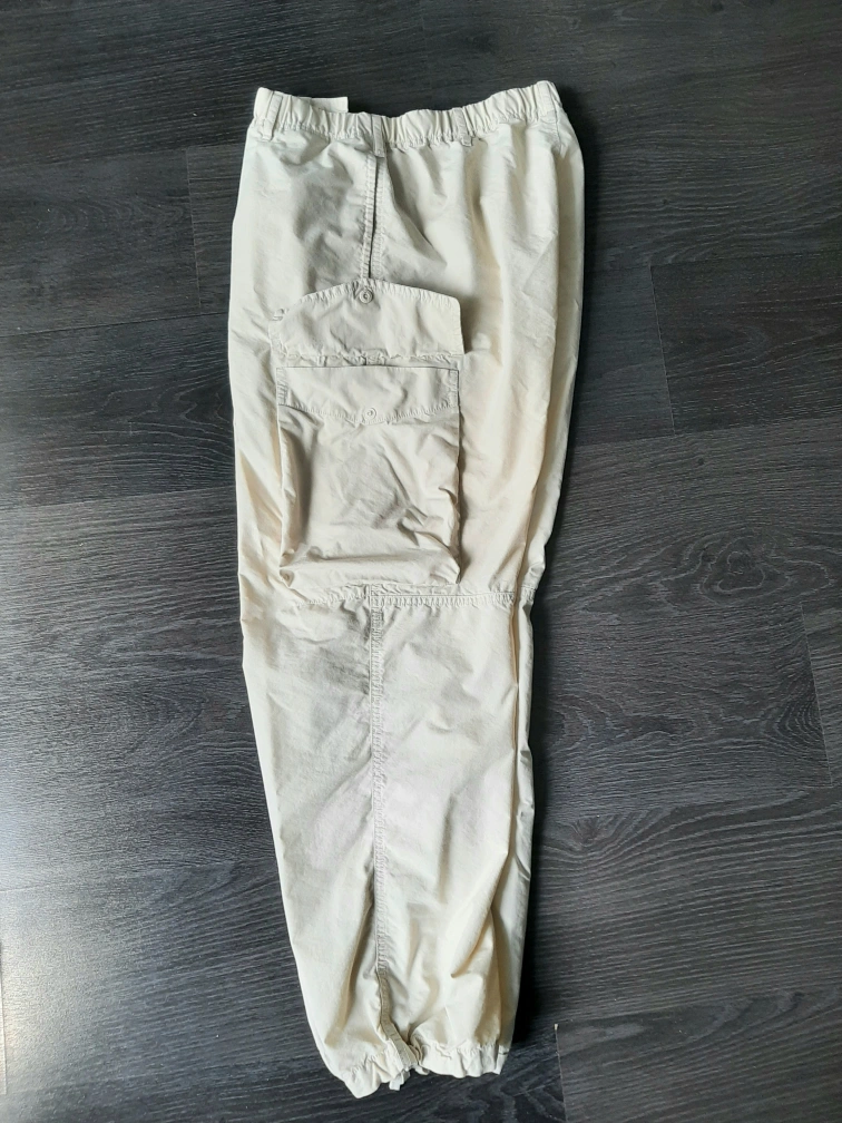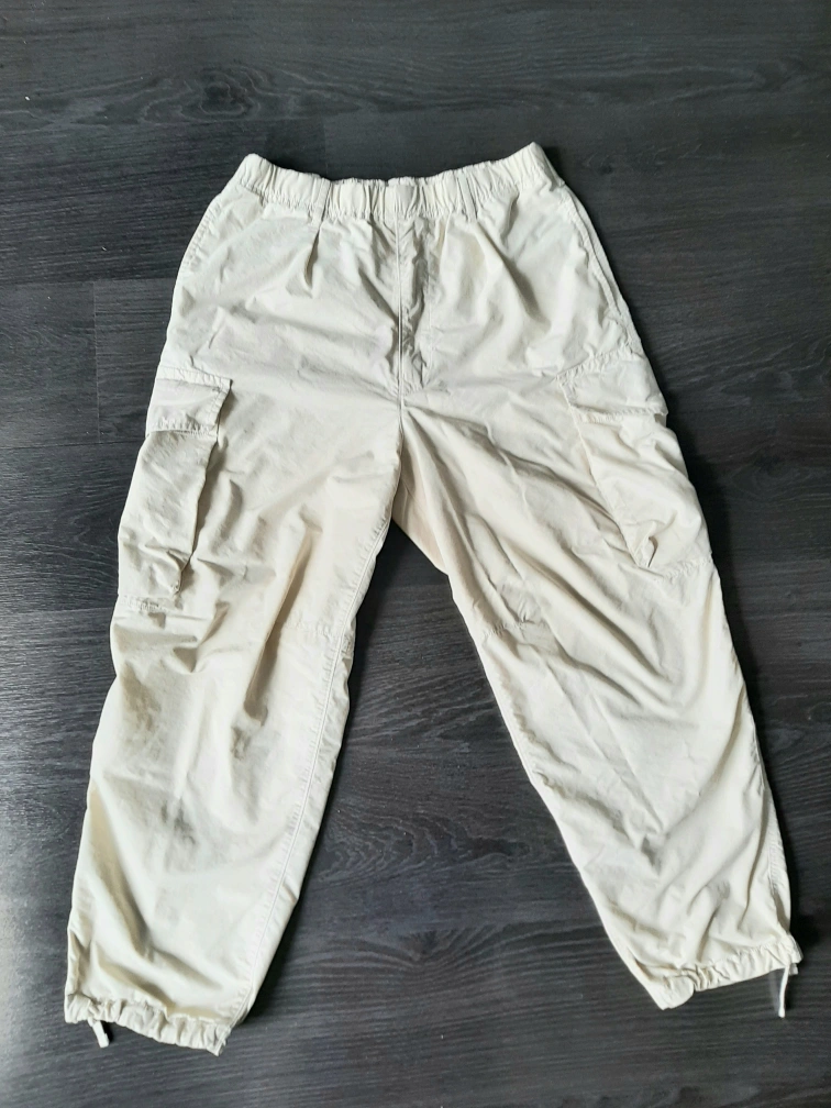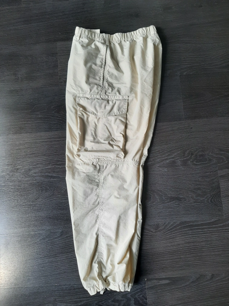 Cargo pants in a light beige colour. Features cargo pockets on the sides and a drawstring waist. These pants would be perfect for a relaxing walk in the park.