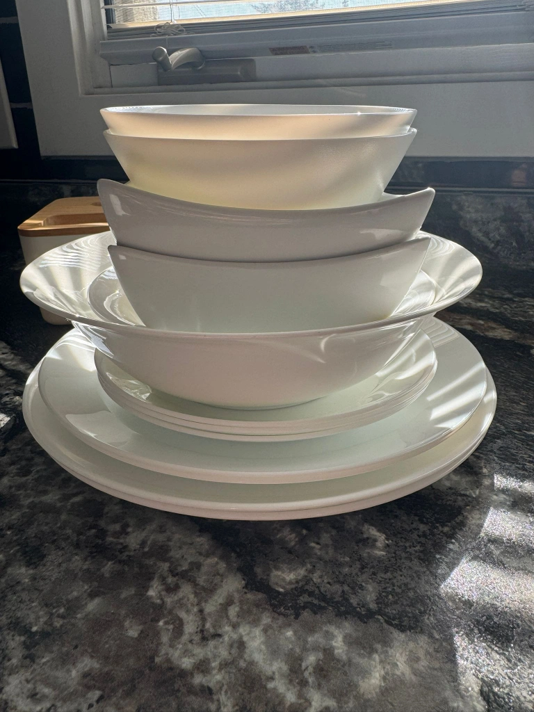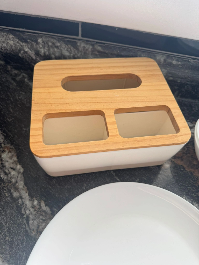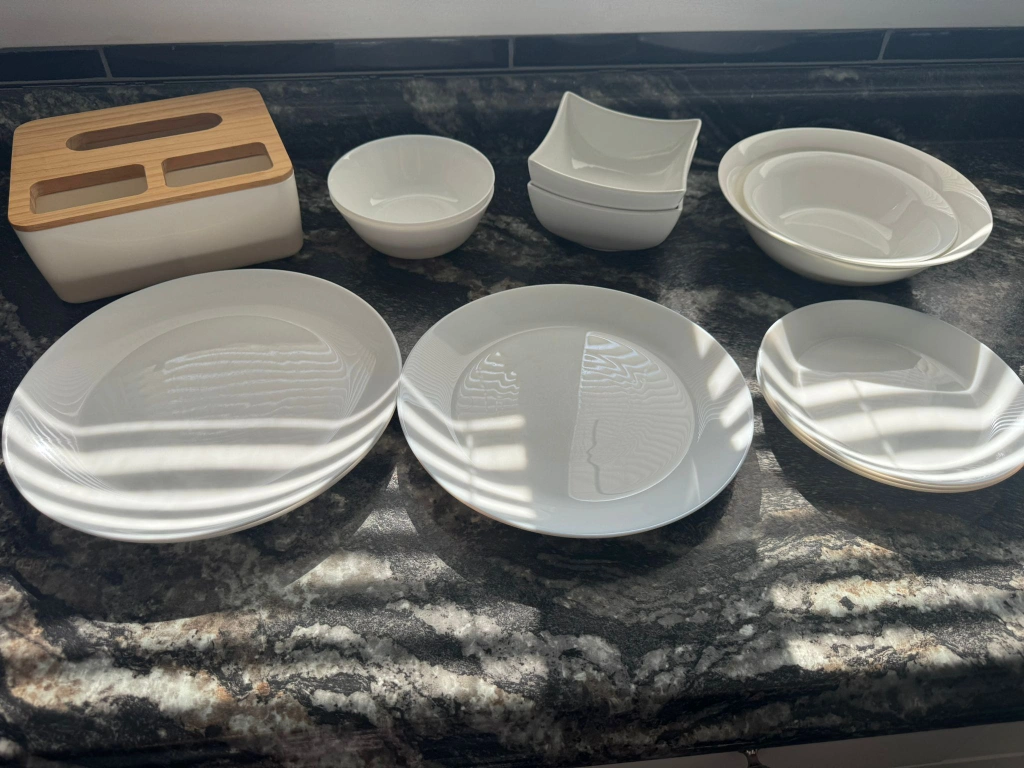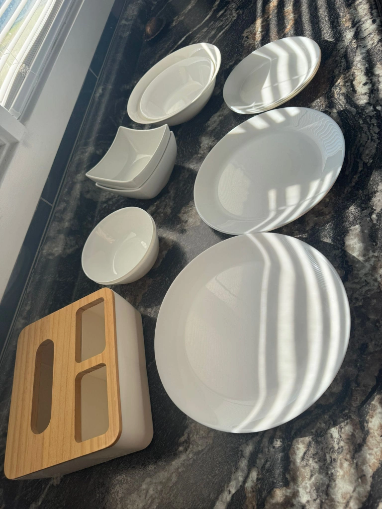 A collection of white dishes and a wooden caddy. Dishes come in different shapes and sizes, including plates, bowls, and more. Makes a great way to present your delicious home-cooked meals.