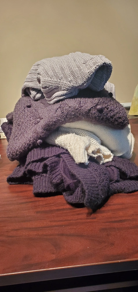 pile 1: A bunch of my cozies and warmest knjt sweaters in a variety of colours, including shades of purple, cream, and grey. one is sized small, the others are a range of oversized and loose to wildly oversized (think potato sack) which honestly I love for lounging around the house in winter.